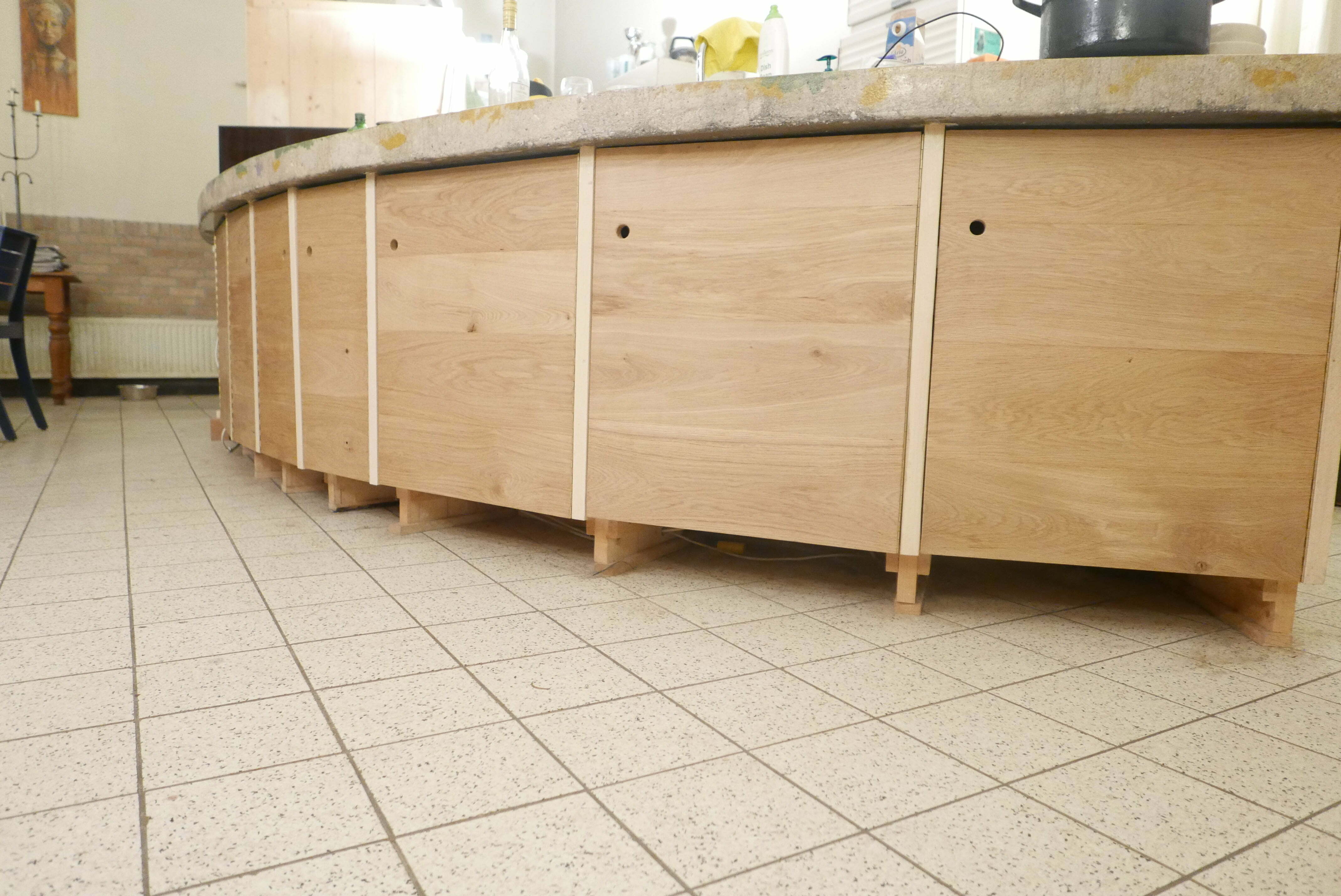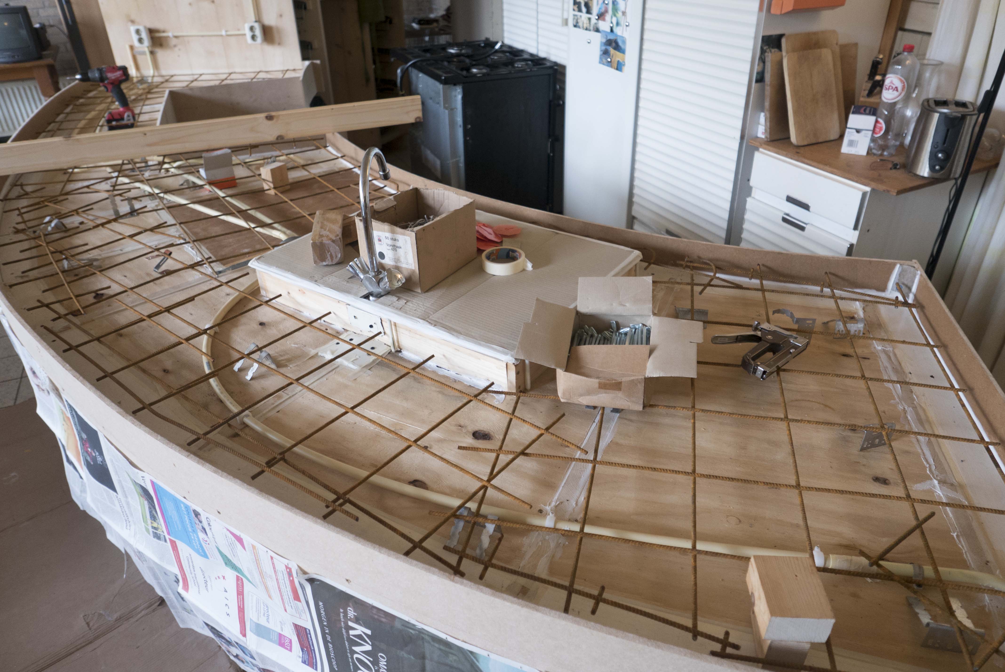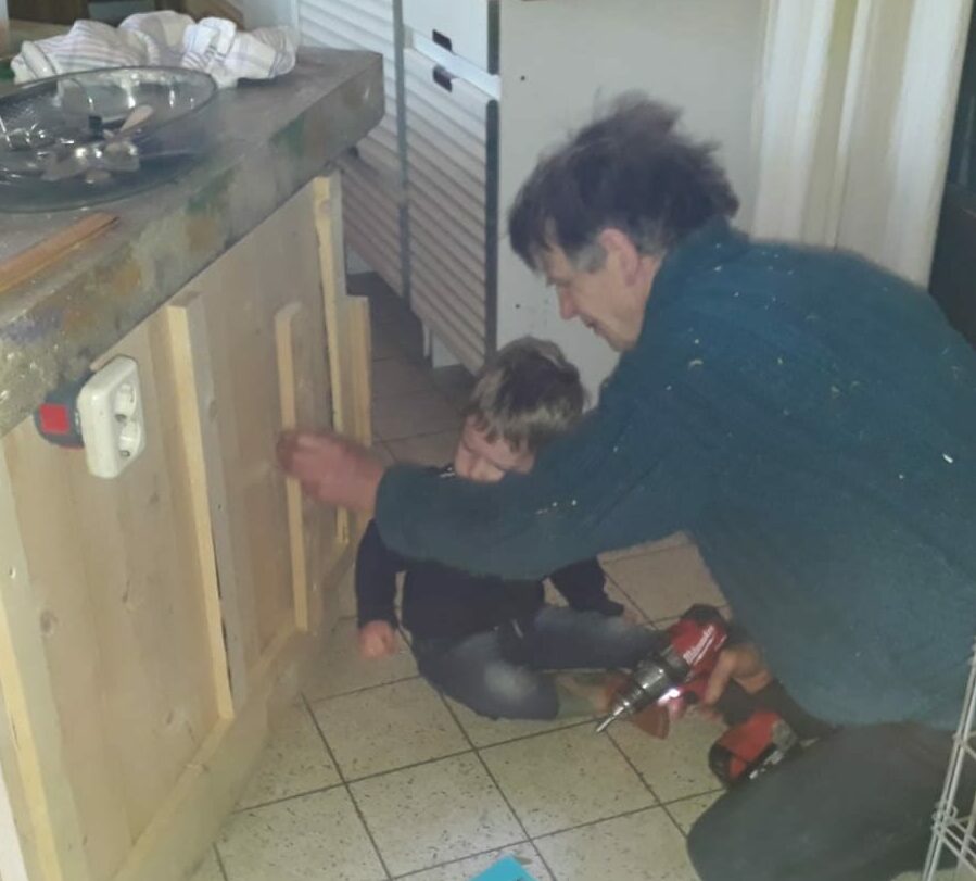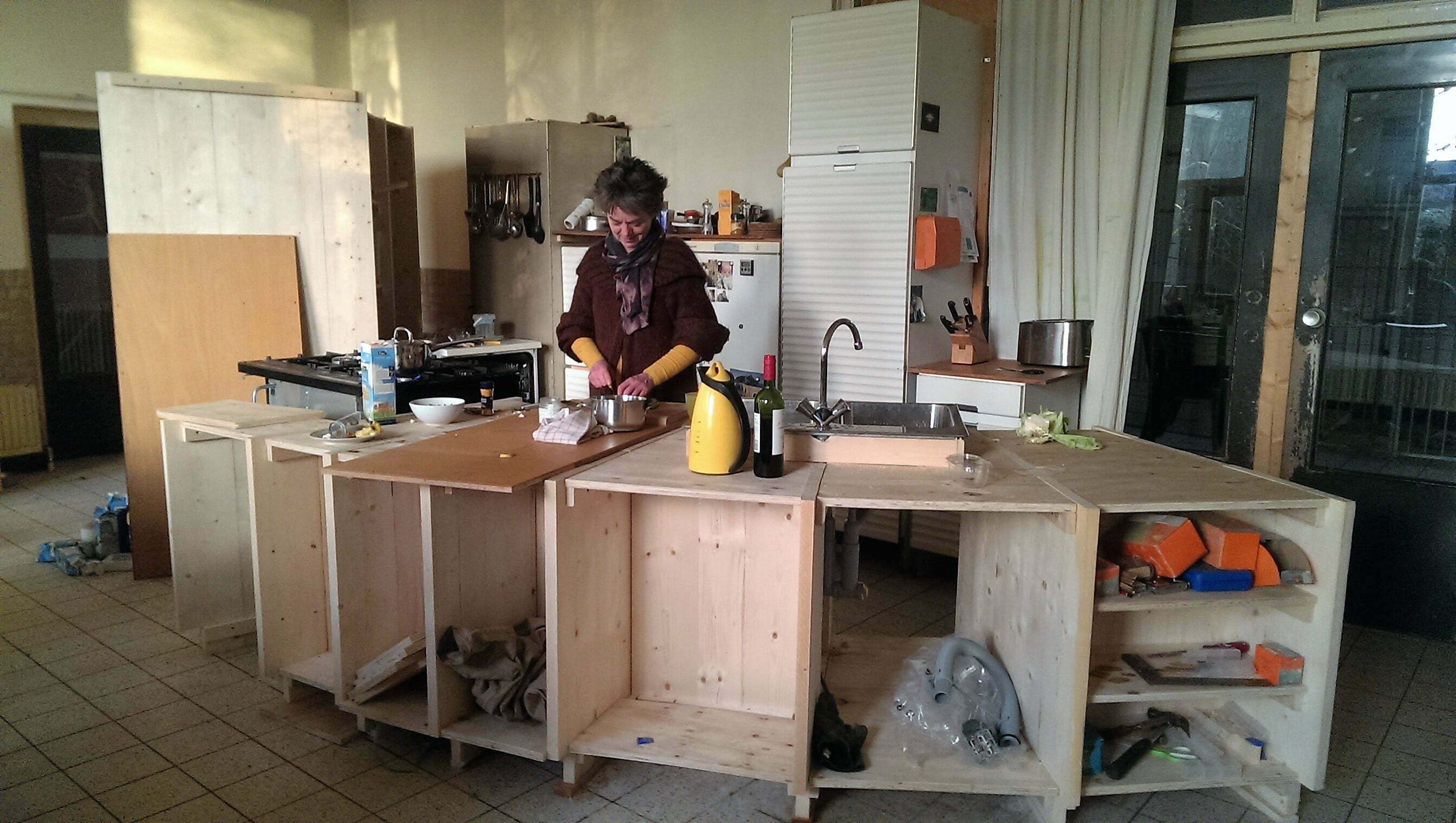 Keuken 17 juni 2021 Paarden schuilplaats Meditatieruimte bestaande keuken sloop bestaande keuken improviseren met koken skelet voorbereiding storten blad beton met kleurstof aanbrengen kleur hoge kasten onderkasten hulpje