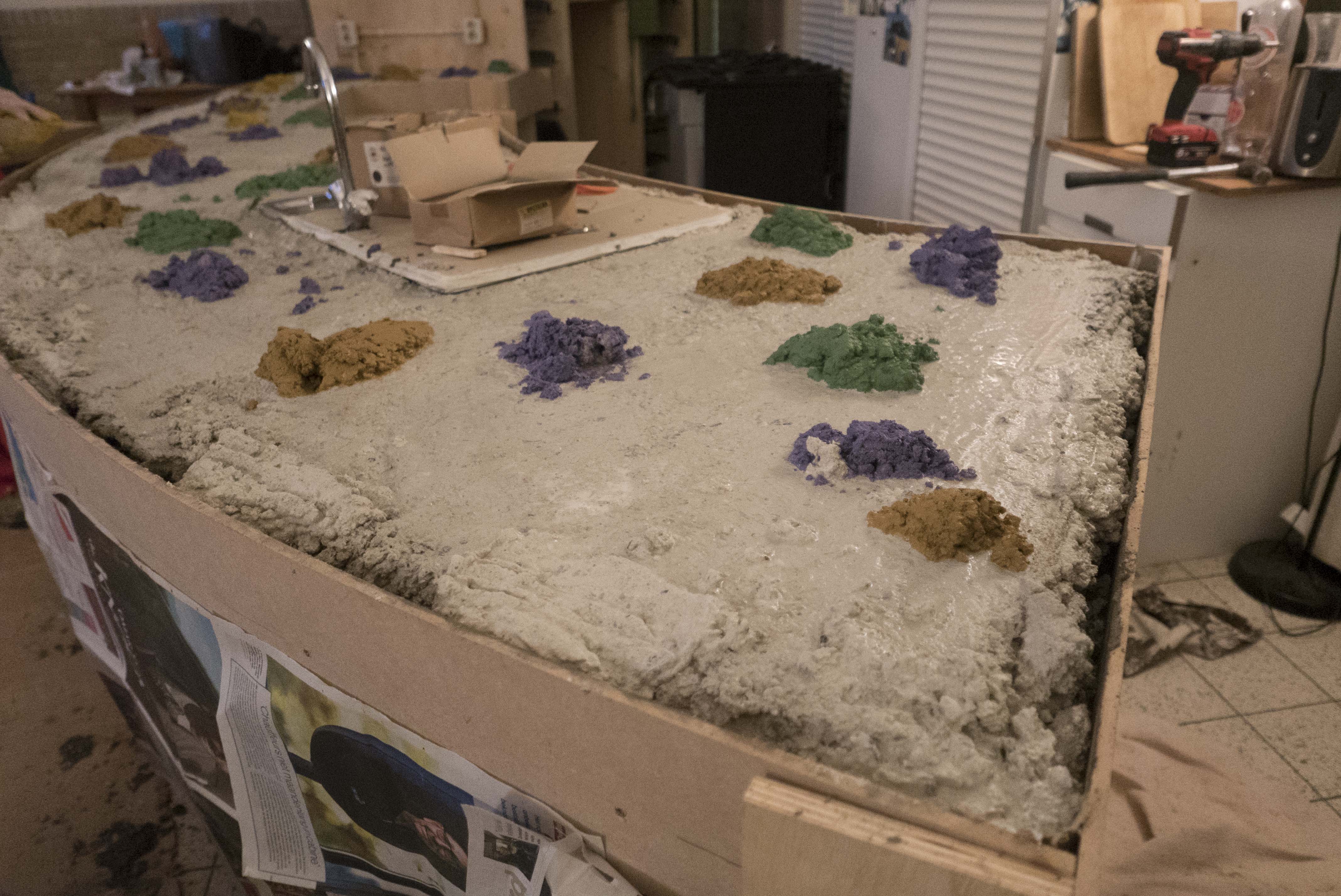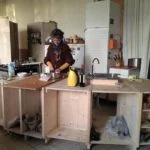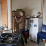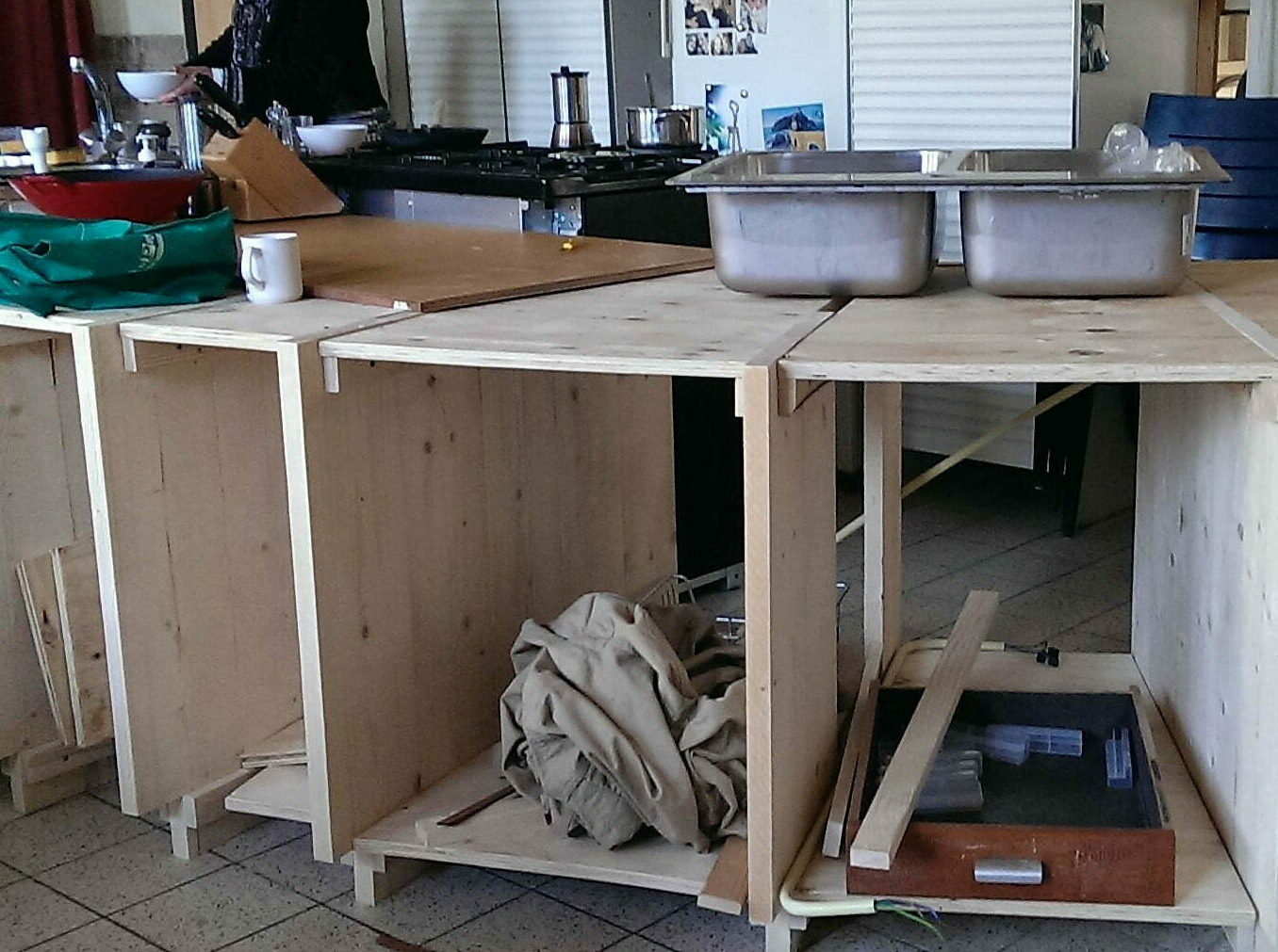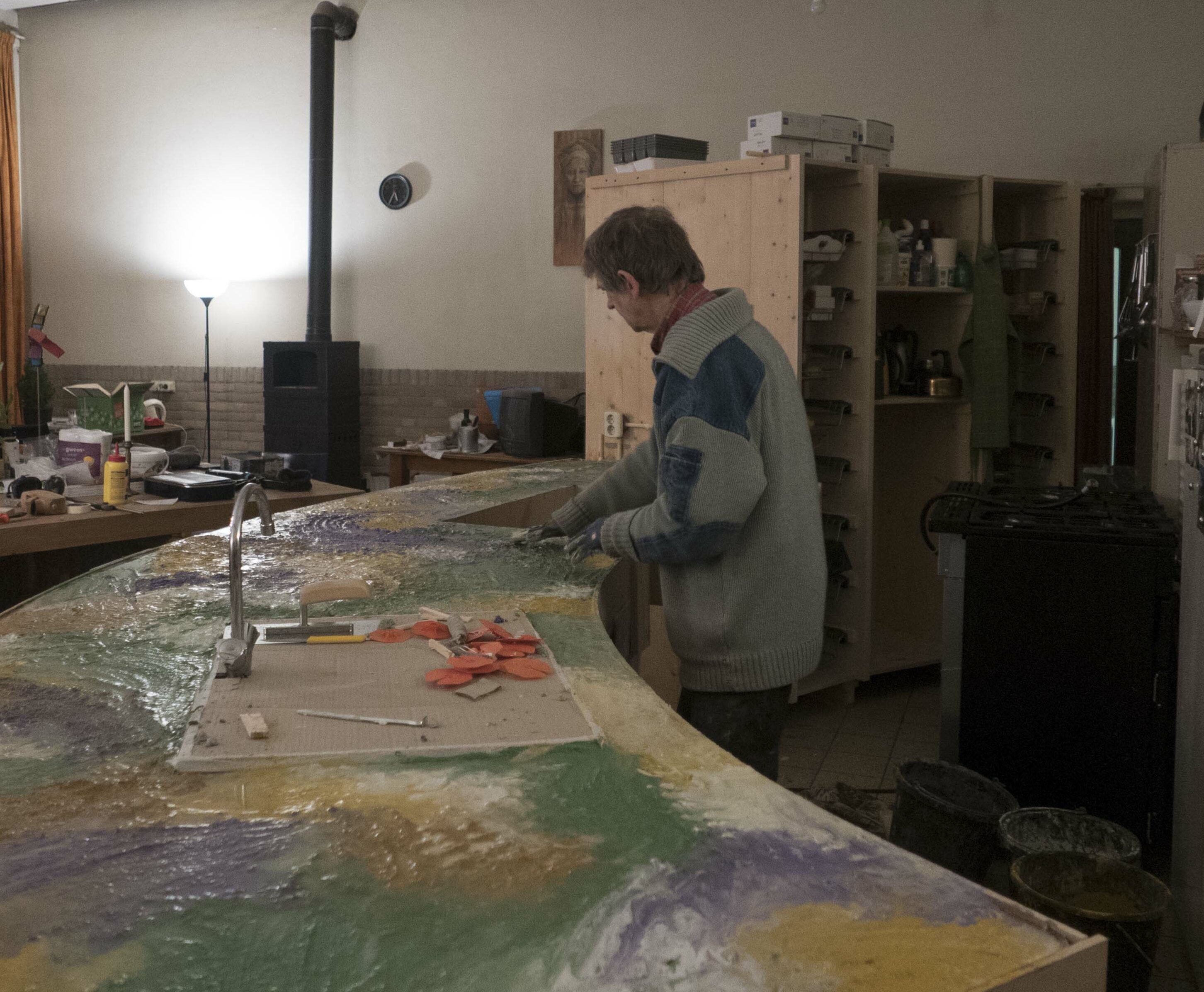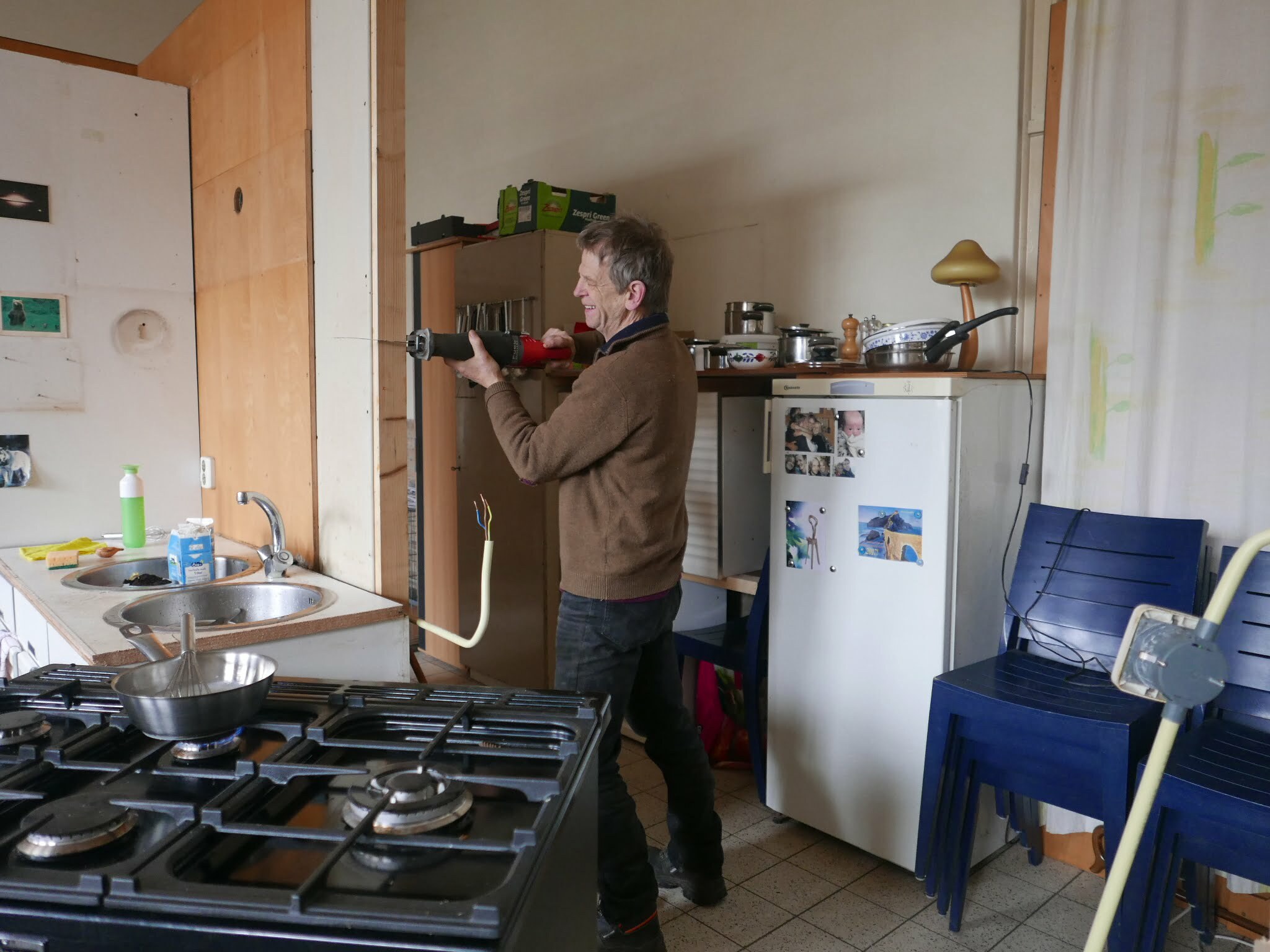 Keuken 17 juni 2021 Paarden schuilplaats Meditatieruimte bestaande keuken sloop bestaande keuken improviseren met koken skelet voorbereiding storten blad beton met kleurstof aanbrengen kleur hoge kasten onderkasten hulpje