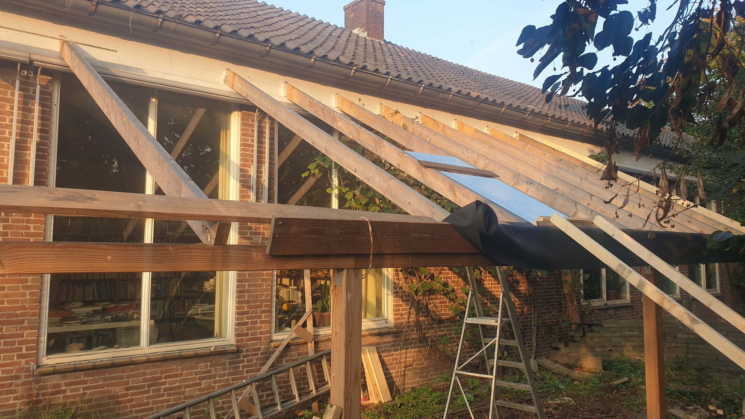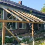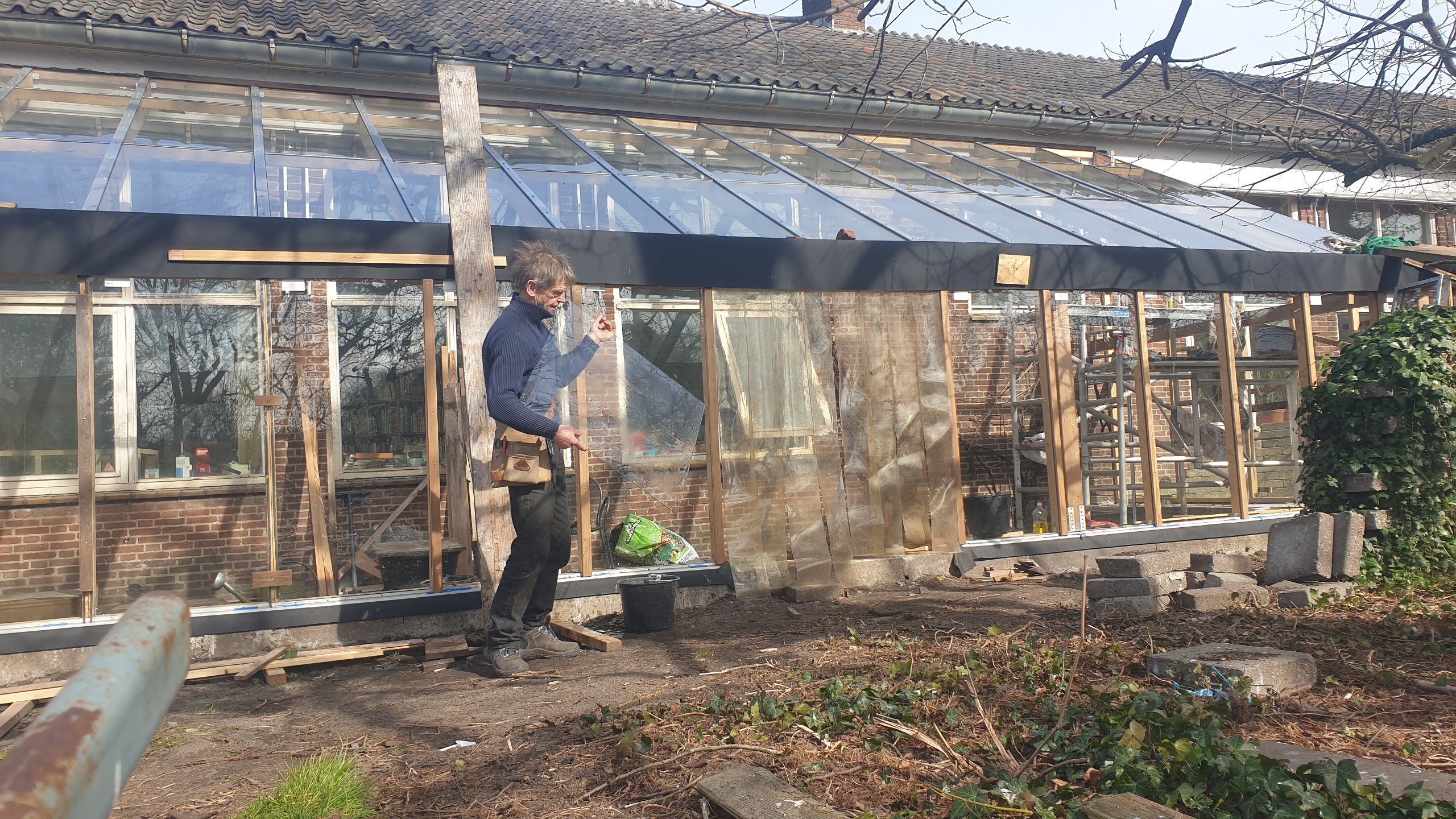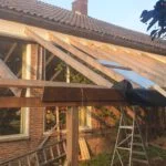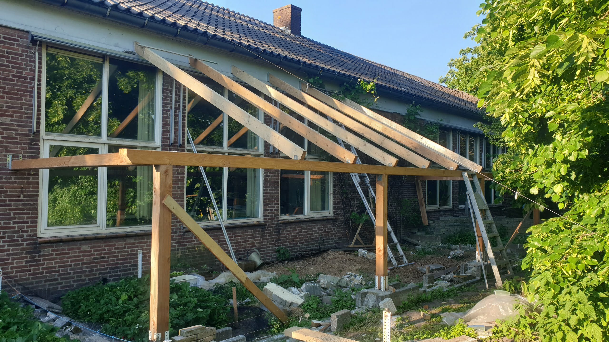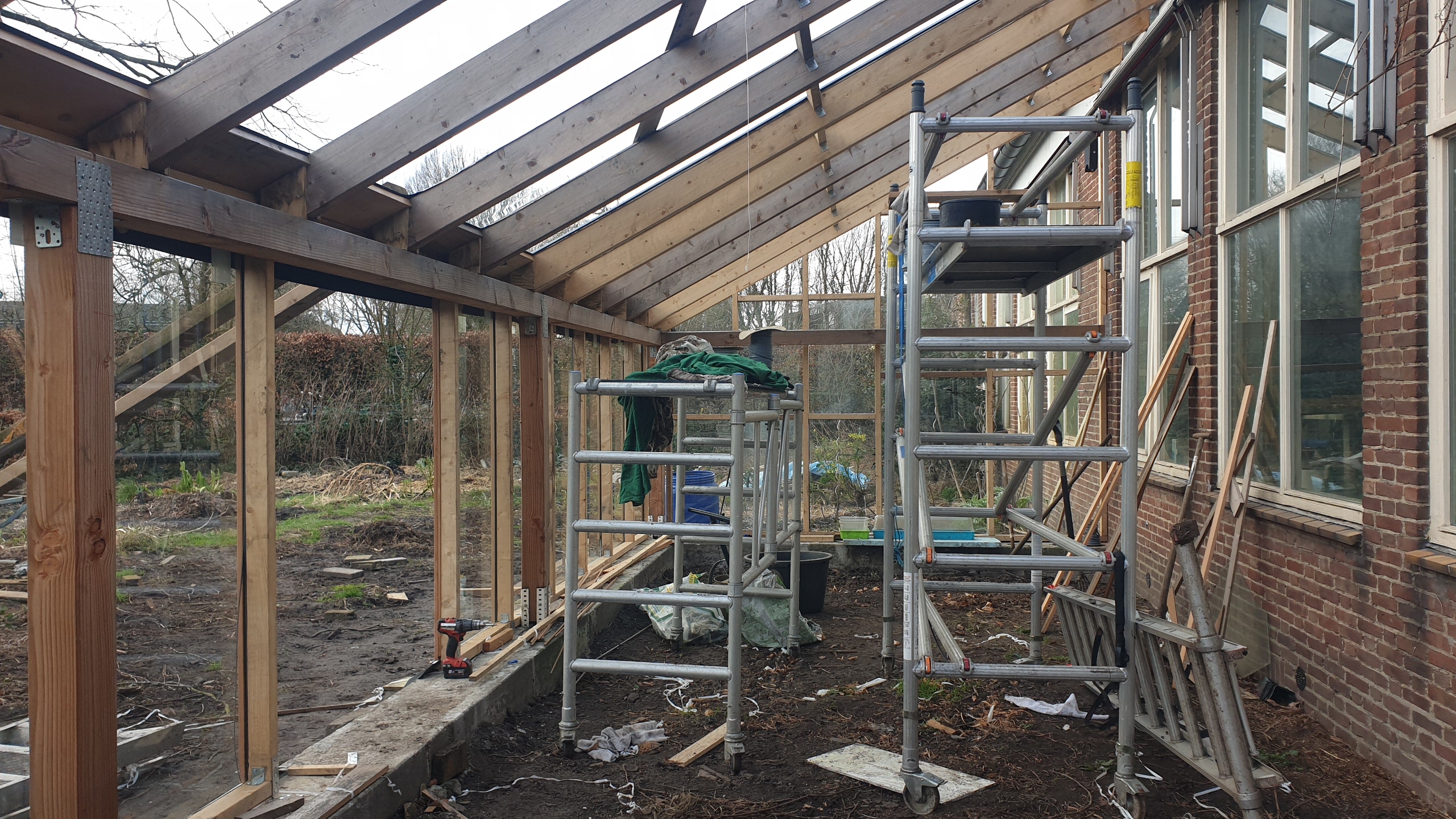 Serre 17 juni 2021 Eigen Woonhuis Paarden schuilplaats De eerste dakbalken dakbalken eerste glas glasgevel binnenzijde de eerste plantjes