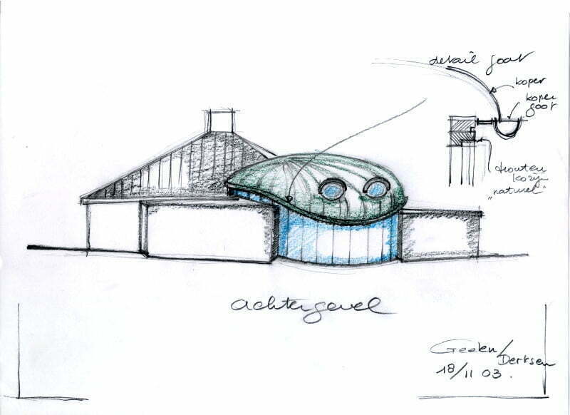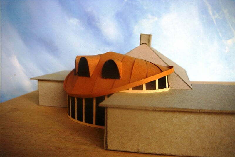 Ontwerp voor een uitbreiding en verbouwing van een woonhuis waarbij een bijzonder en contrasterend volume aan de bestaande bebouwing is toegevoegd.
