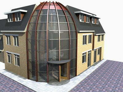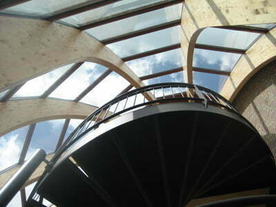 De hoek van het kantoorpand is gevuld met een bijzonder trappenhuis.