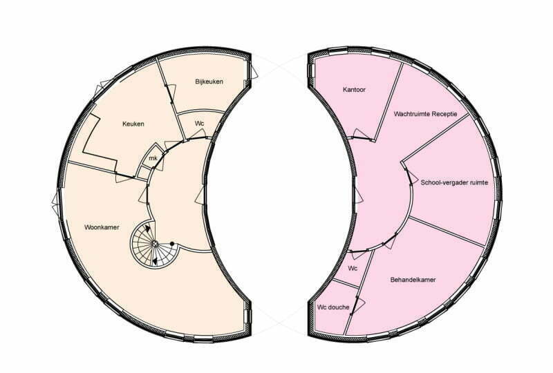 Twee ontwerpen voor een gezondheidscentrum met woning. Beide ontwerpen gaan uit van een zelfde plattegrond maar verschillen in omvang en materialisering. Het ontwerp toont de balans tussen wonen en werken.