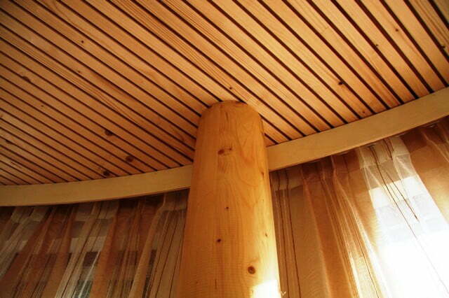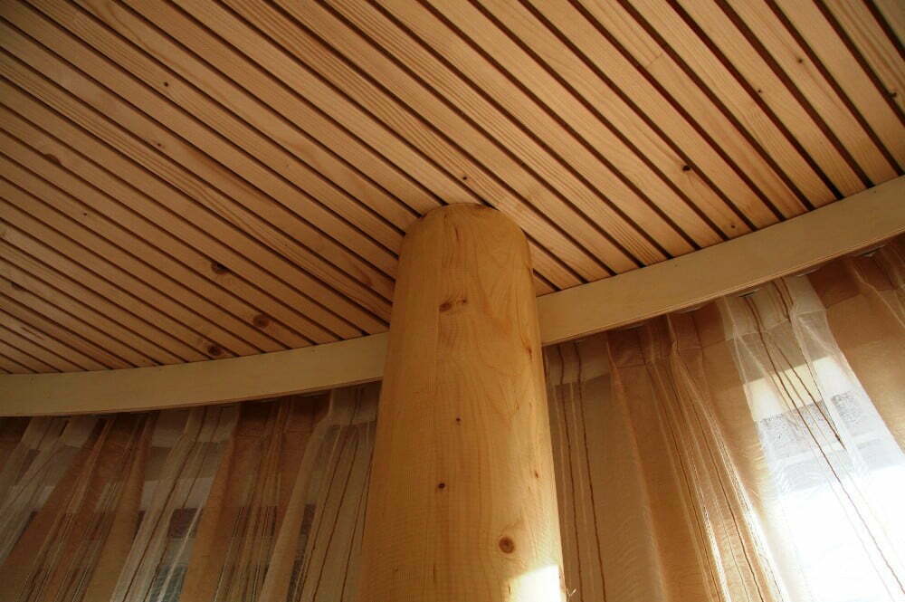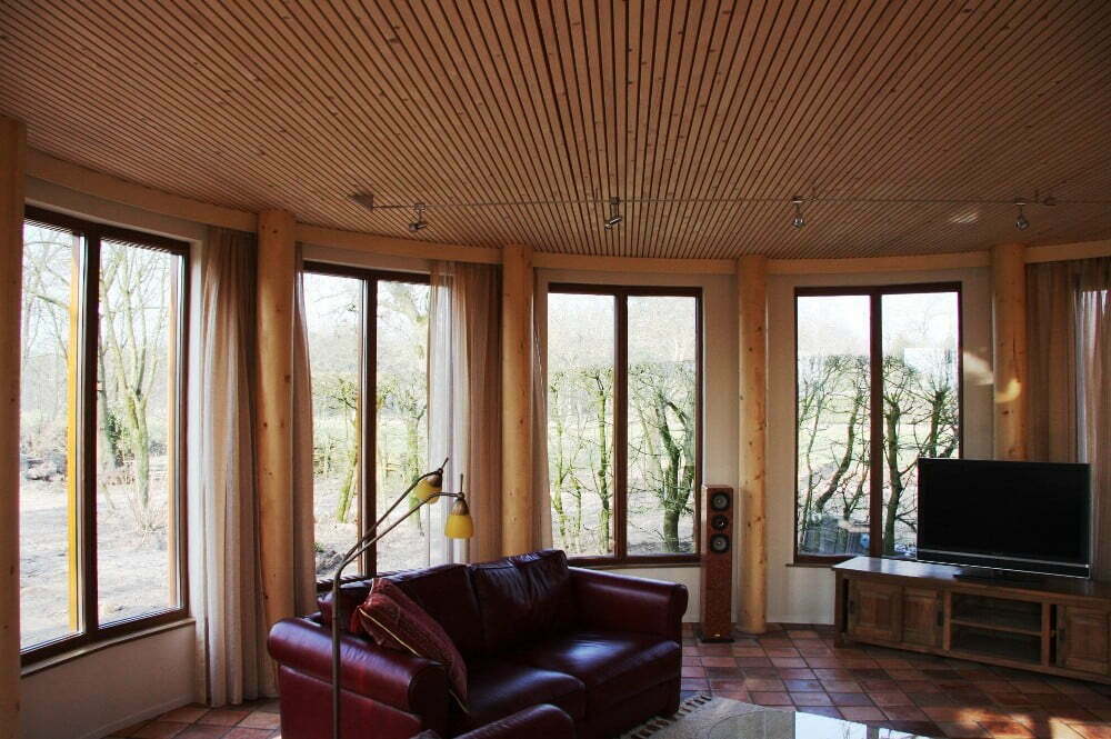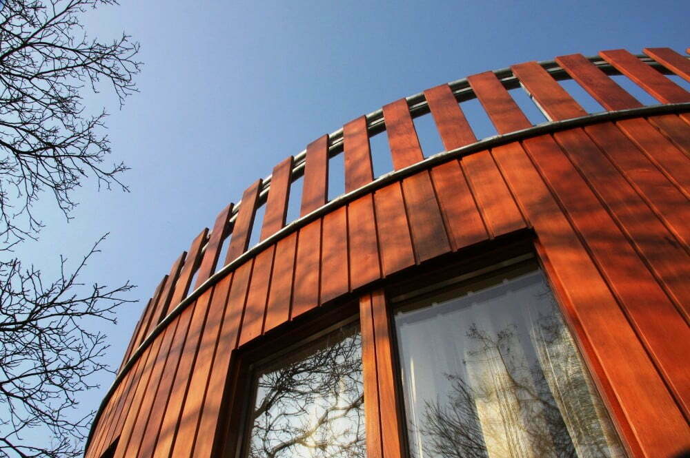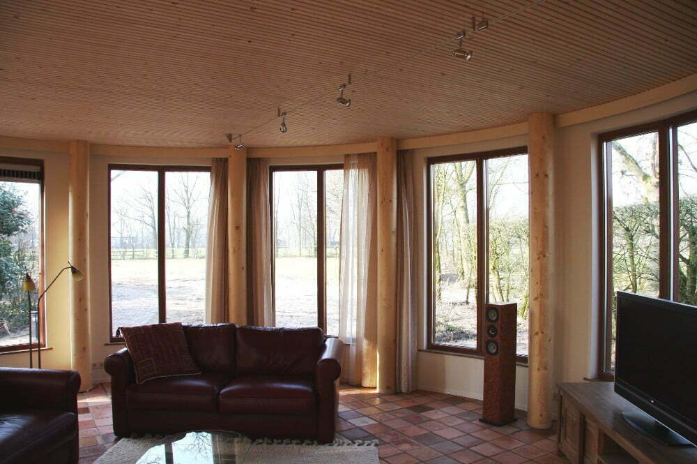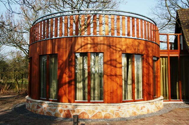 Om de relatie met de tuin te vergroten is de ronde aanbouw uitgevoerd in hout en voorzien van een grove natuurstenen plint. Naast de gevelafwerking is ook de draagconstructie volledig van hout. Ronde kolommen van gelamineerd vuren dragen een massief houten vloerplaat. Deze Inholz. vloerplaat is opgebouwd uit met duvels (lijmloos) verbonden balken. De balken hebben aan de onderzijde een sponning voorzien van geluidsisolatie. Deze sponning zorgt tevens voor een karakteristieke zichtkwaliteit.
