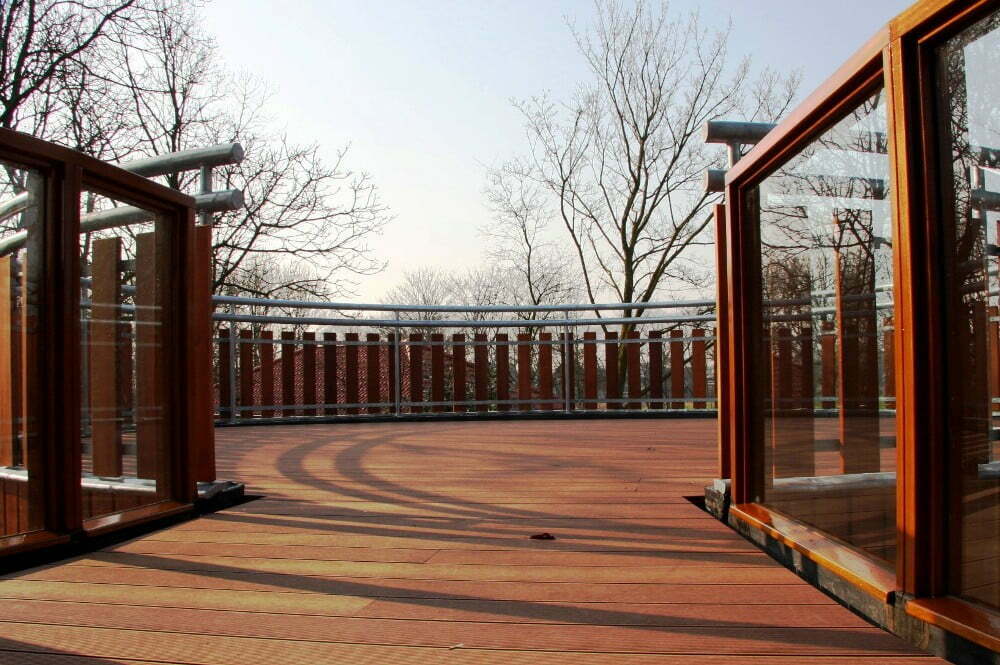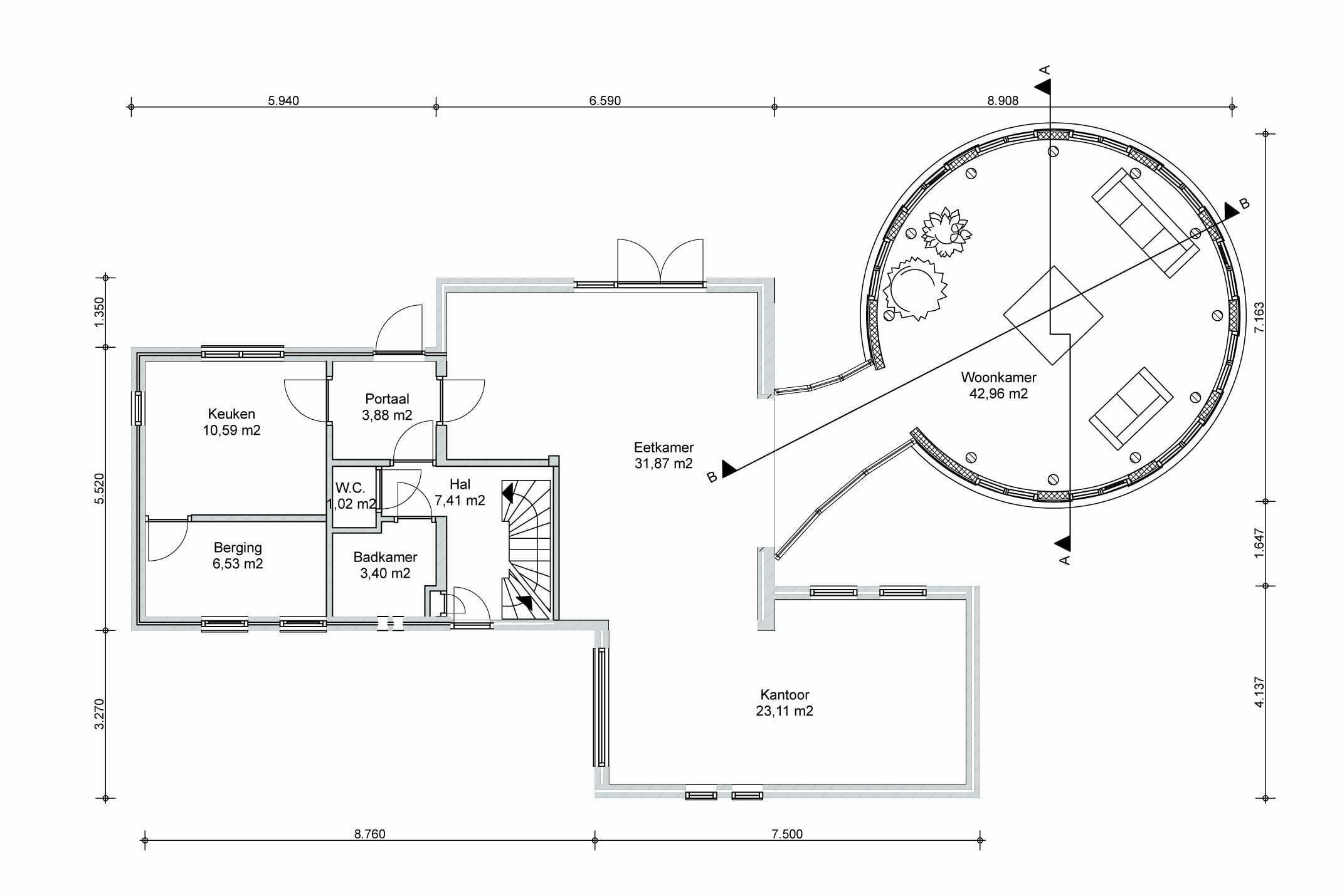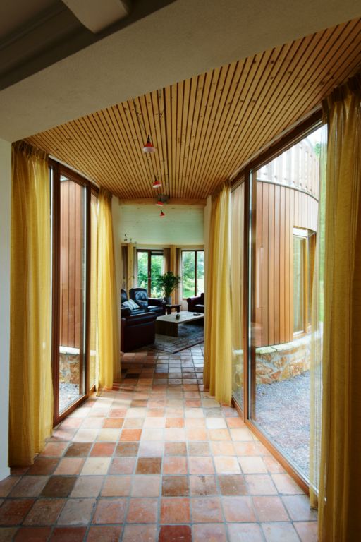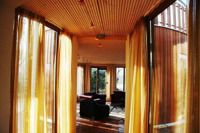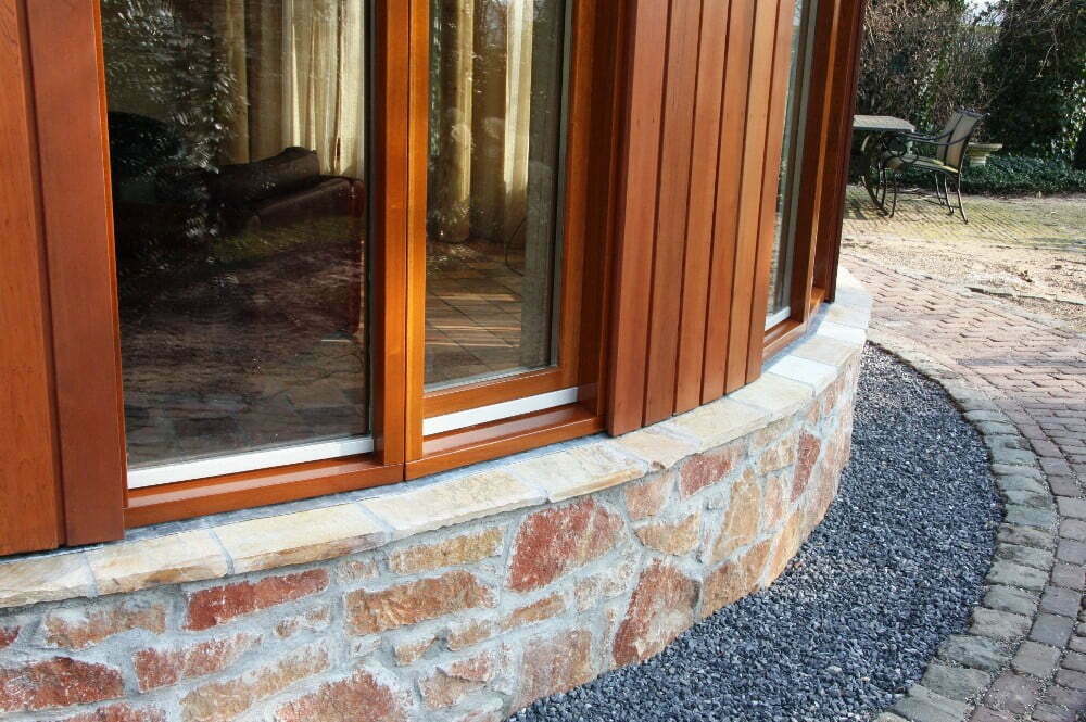 Om de relatie met de tuin te vergroten is de ronde aanbouw uitgevoerd in hout en voorzien van een grove natuurstenen plint. Naast de gevelafwerking is ook de draagconstructie volledig van hout. Ronde kolommen van gelamineerd vuren dragen een massief houten vloerplaat. Deze Inholz. vloerplaat is opgebouwd uit met duvels (lijmloos) verbonden balken. De balken hebben aan de onderzijde een sponning voorzien van geluidsisolatie. Deze sponning zorgt tevens voor een karakteristieke zichtkwaliteit.