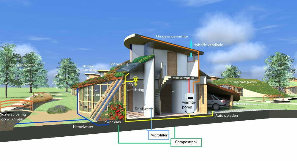 Door het ontbreken van auto's in het straatbeeld en het inzetten van de dakvlakken als onderdeel van het landschap voert de natuur de boventoon in de wijk. Verzameld regenwater wordt in de wijk opgevangen en op natuurlijke wijze gefilterd en geschikt gemaakt voor gebruik in de woning. De woningen zijn zon georiënteerd waarbij iedere woning de mogelijkheid heeft een kweekkas te gebruiken voor het verbouwen van voedsel.