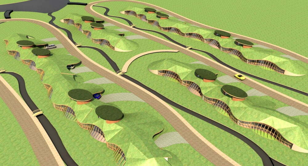 Dit ontwerp is een van de resultaten van een onderzoek naar autarkische (energieneutrale) woningen. Hierbij zijn drie verschillende (in Nederland veel voorkomende) woontypologieën onderzocht. In dit geval is een ontwerp gemaakt voor een woonwijk met geschakelde woningen. Uitgangspunt was dat iedere woning een overdekte parkeerplaats heeft (voorzien van oplaadpunt). Bezoekers kunnen de auto aan het begin van de wijk parkeren.