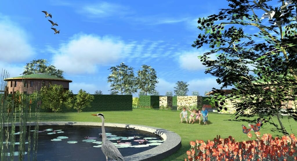 Centraal in het ontwerp staat de relatie tussen mens en natuur. Dit is terug te vinden in de inrichting van het terrein waarin wandelroutes de diverse plekken met elkaar verbinden. Dit biedt bewegingsvrijheid voor iedereen en geeft de mogelijkheid voor verschillende ervaringen met de natuur. Diverse plantensoorten, waterelementen, een kruidentuin, een moestuin en verschillende fruitbomen zorgen voor een gevarieerd en interactief landschap.