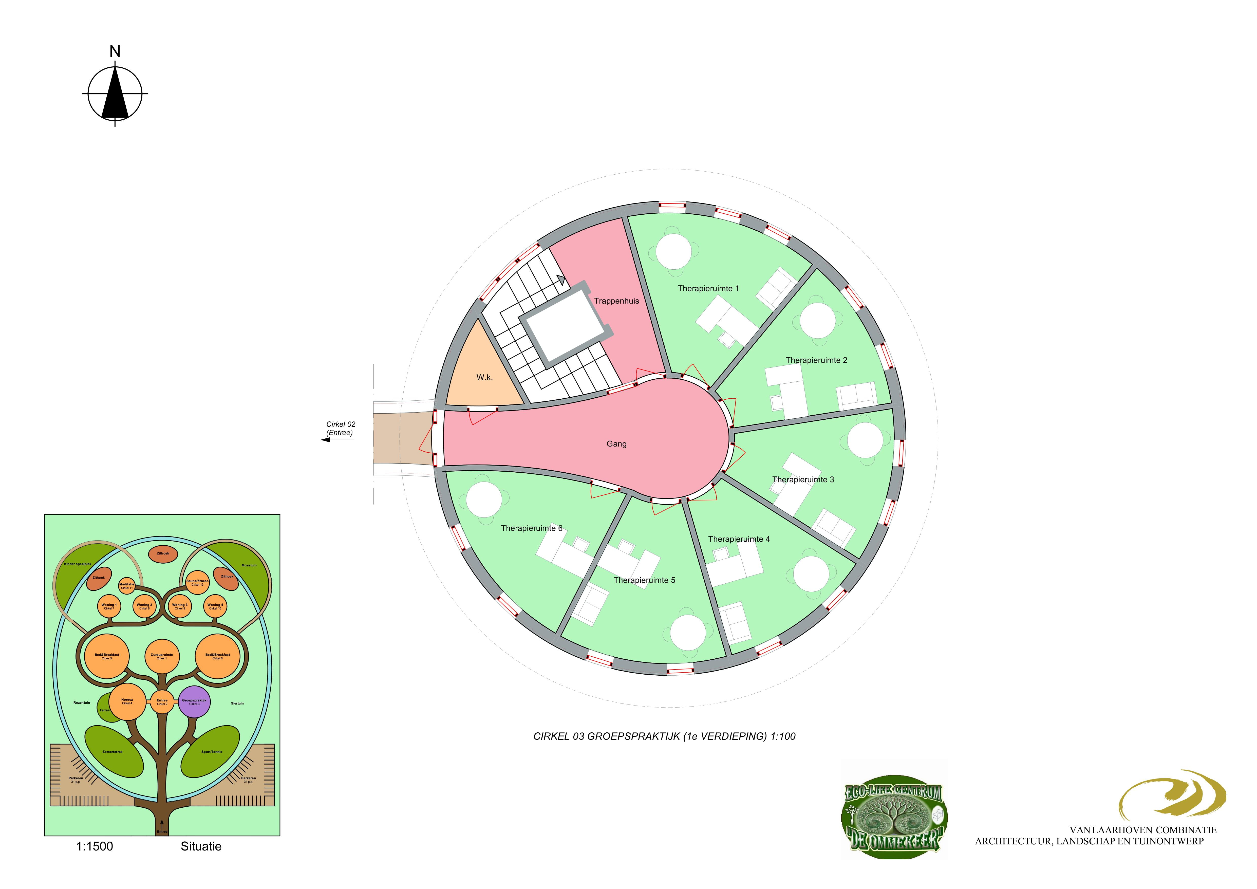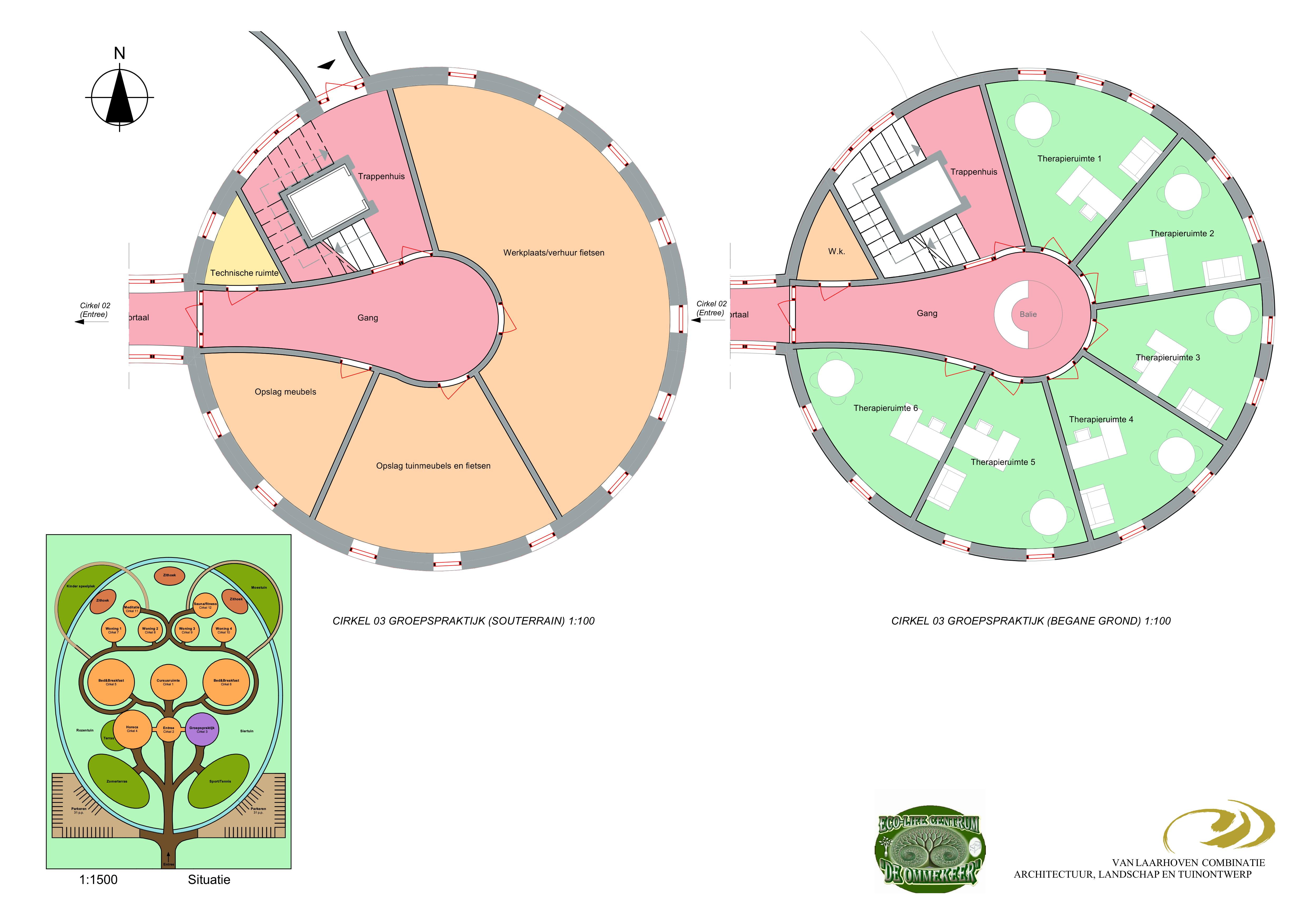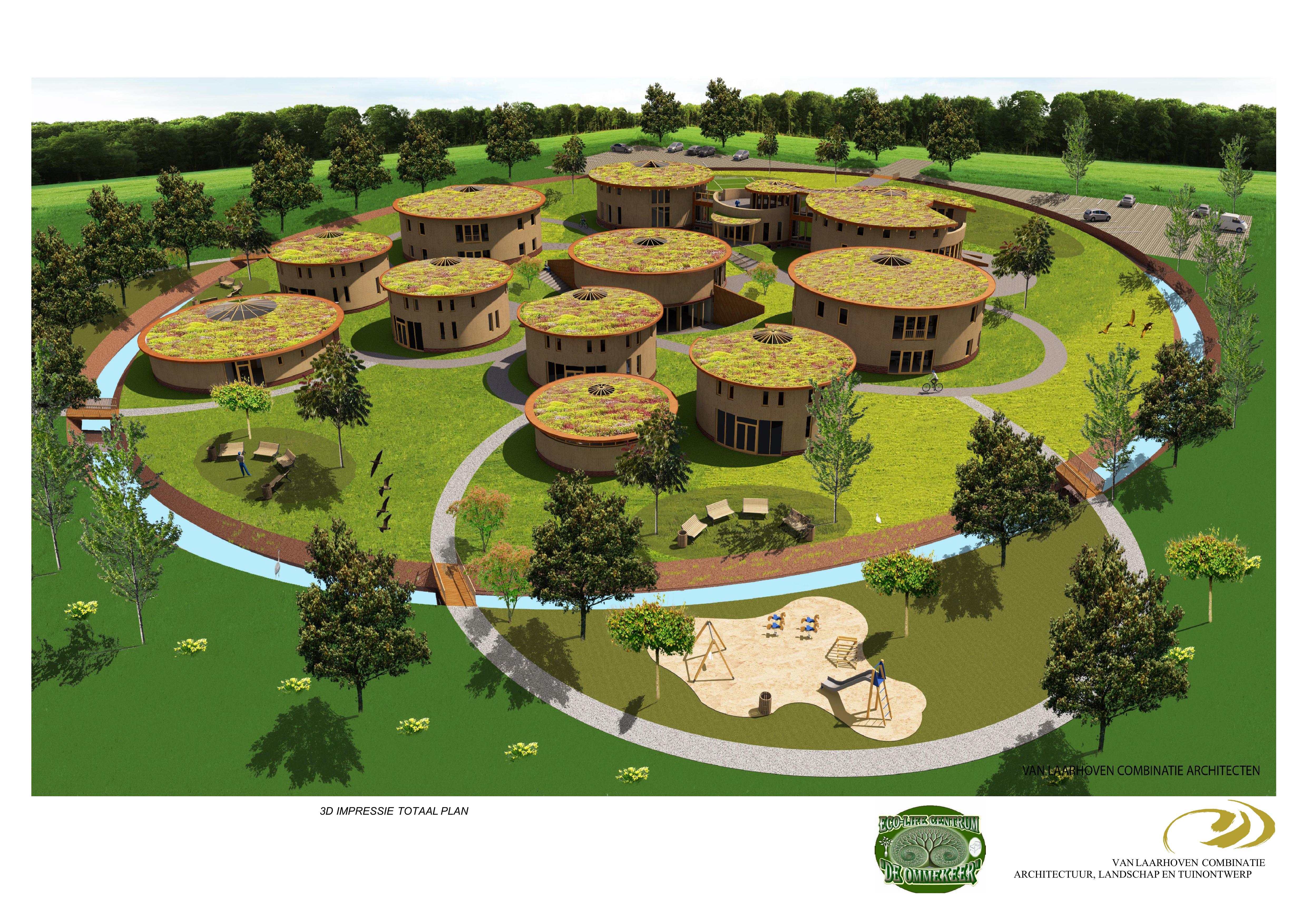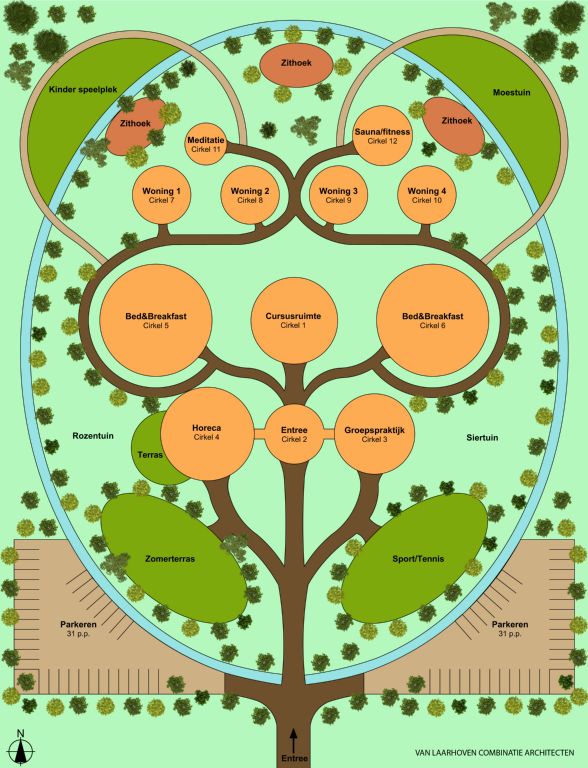 Het gezondheidscentrum bestaat uit 12 cirkels met verschillende gebruiksfuncties: een bed en bio-Breakfast met een complementaire therapeutische groepspraktijk, bio & etherische shop, cursus - Lezingen - workshop en concertzaal. En ten slotte een himalaya Infrarood Sauna, Stilte, Meditatie, restaurant, woningen en een fitnessruimte. Dit alles in een puur natuurgebied met tennisbanen, Golfvelden, Kinderspeelplek en Zonne terrassen. Om te kunnen “Her-Bronnen aan de Oer-Bronnen van het LEVEN” Dit gezondheidscentrum wordt volledig ecologische en zelfvoorzienend uitgevoerd. Hierbij zijn materialen als kalkhennep, schelpen, groene daken, hout, etc. zeer geschikt.