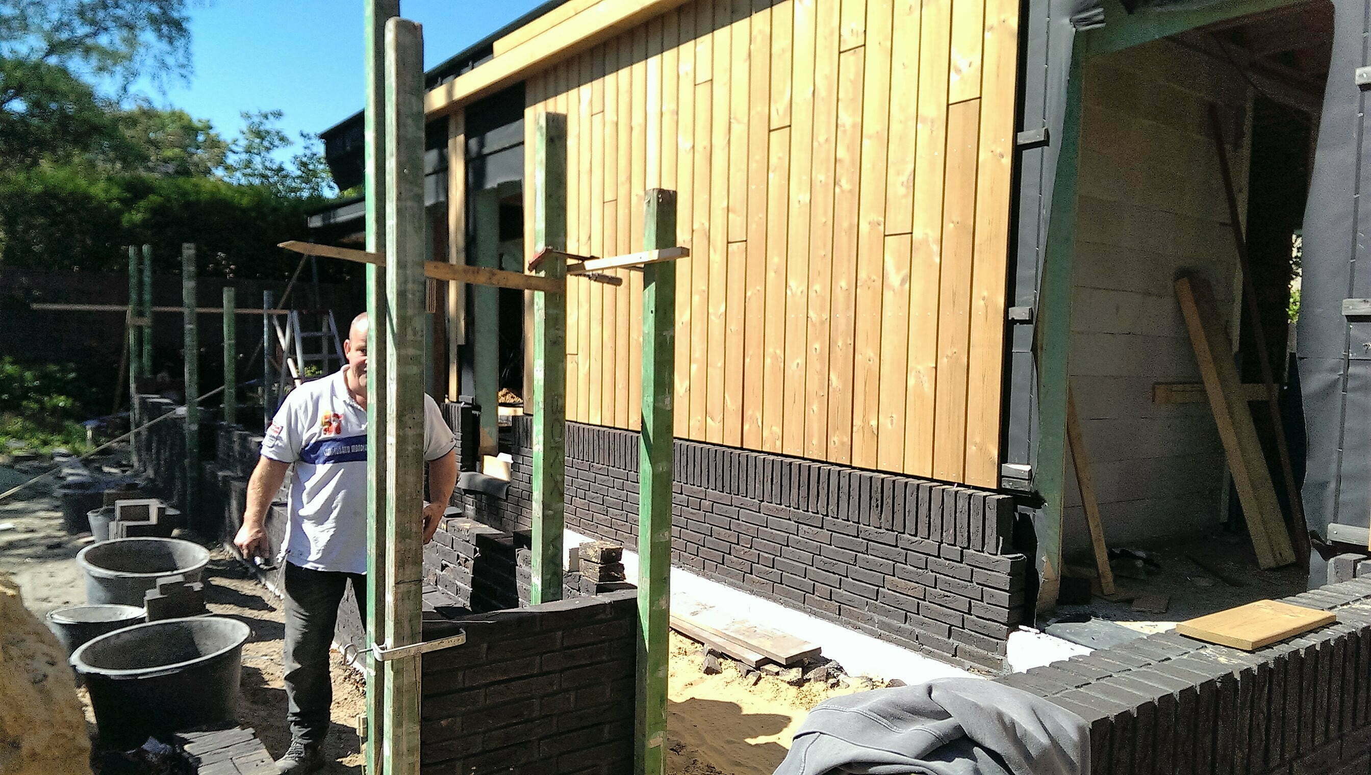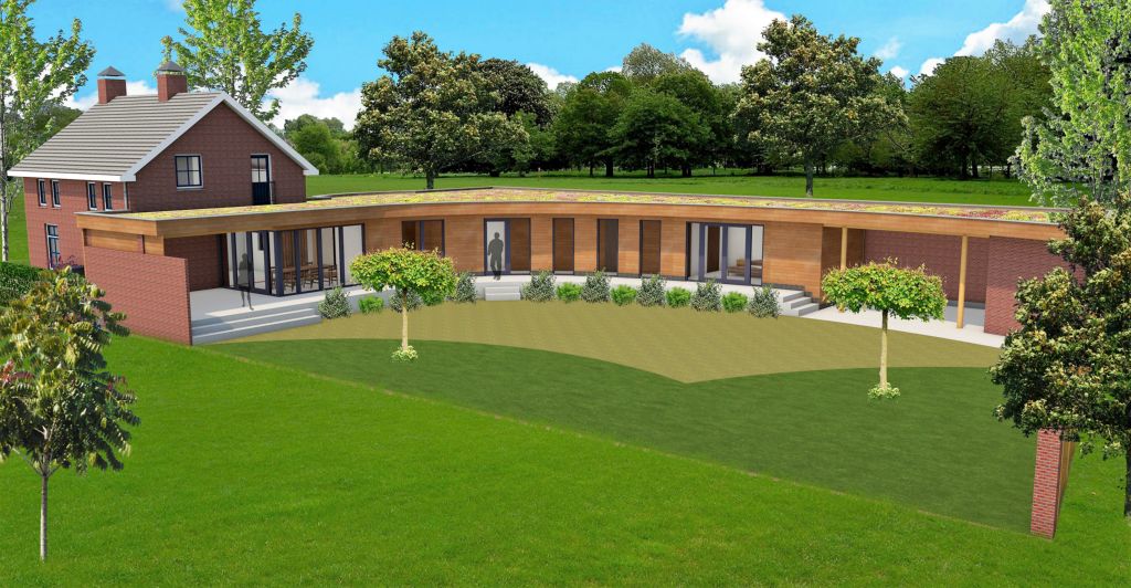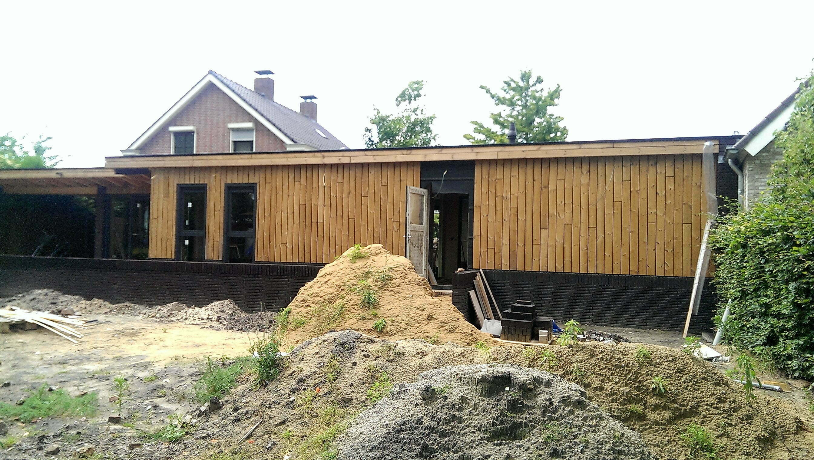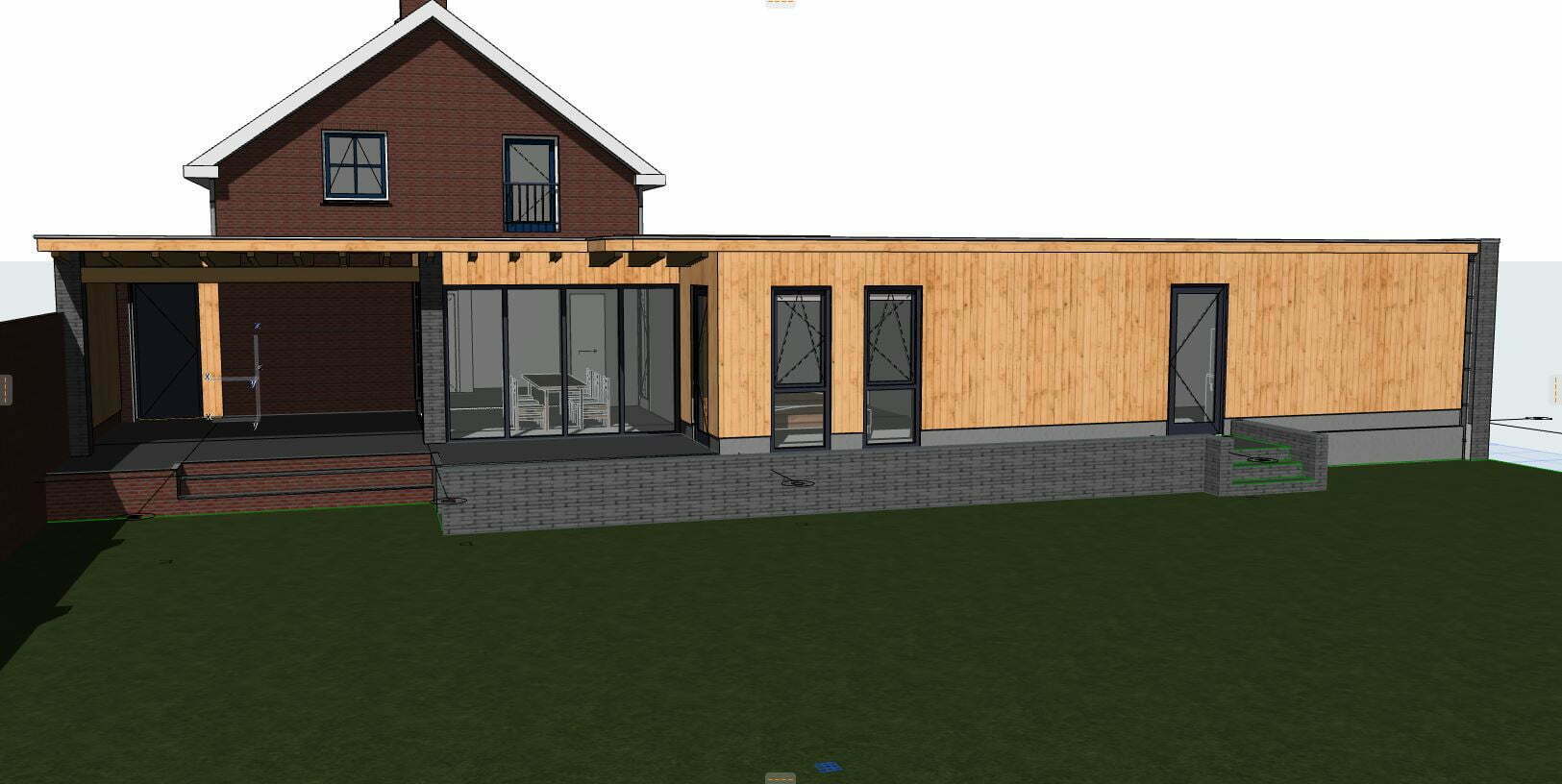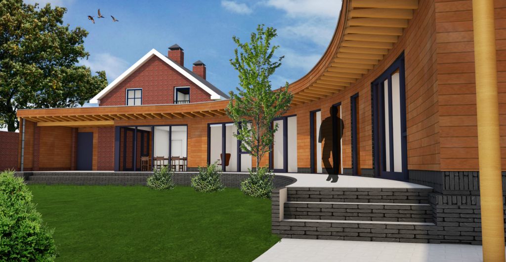 Een forse uitbreiding van de bestaande woning. De bestaande keuken wordt vergroot en daarnaast komt er een kantoor, slaapkamer, badkamer, wasruimte, toilet, berging, carport en tuinberging in de aanbouw. De aanbouw wordt verfraaid met houten geveldelen, vlonder en een groot overstek.