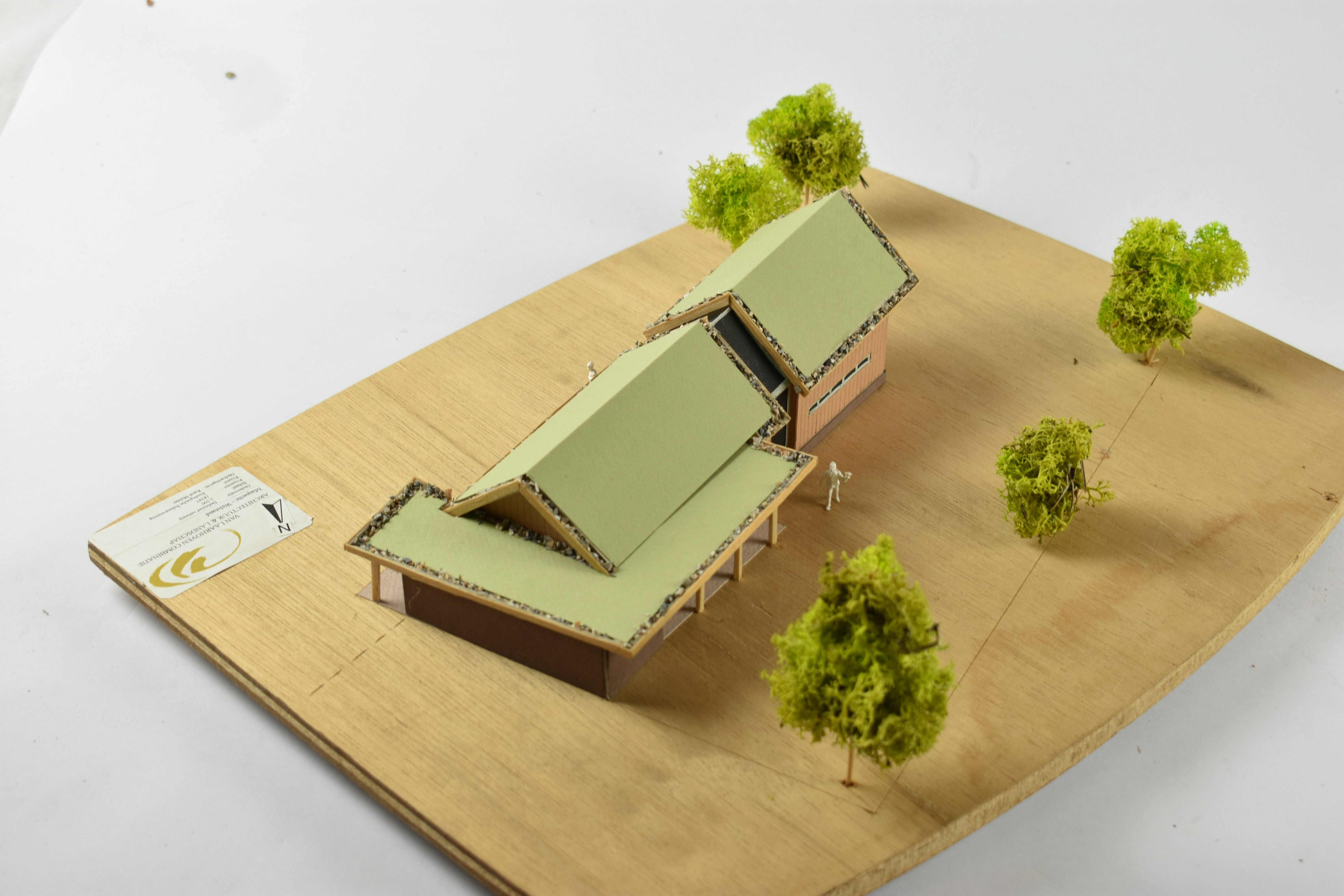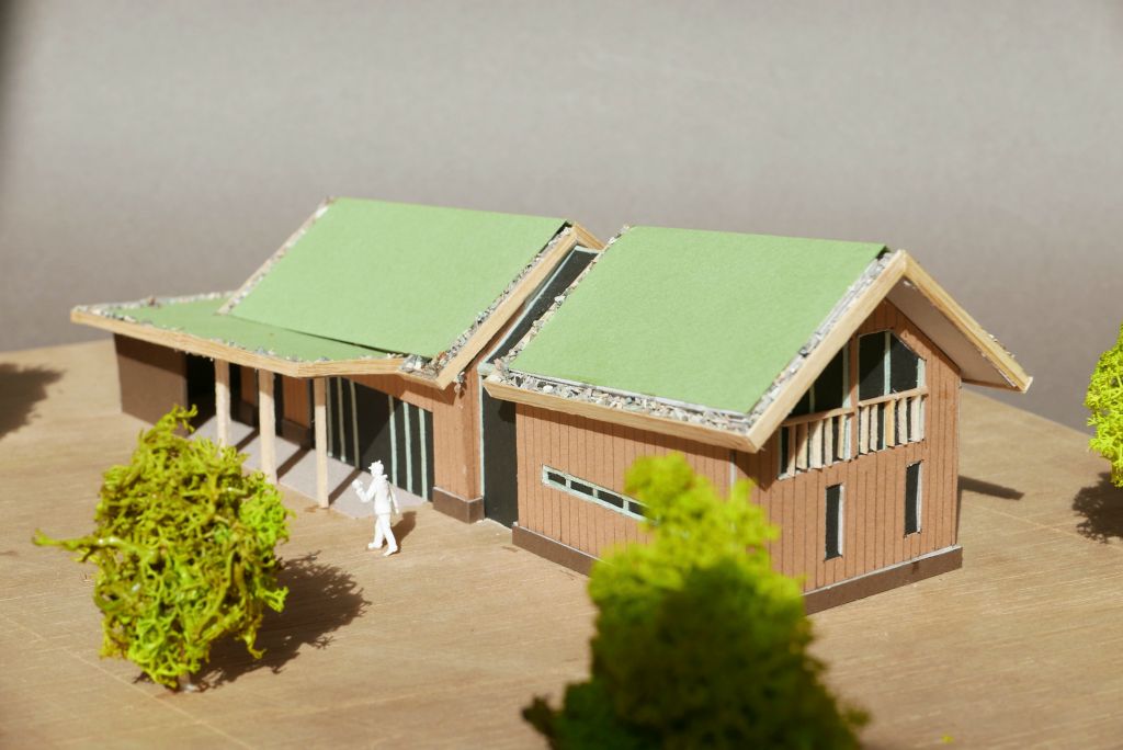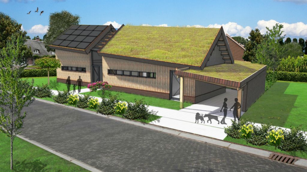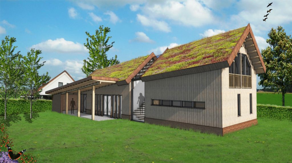 Een ecologische woning in een ander jasje: 'een ecologische schuurwoning'. Eenvoud van vorm, materialen en detaillering zijn belangrijke uitgangspunten bij deze ontwerpvraag. Door grote verschillen in het programma van de begane grond en 1e verdieping is het idee ontstaan om de kap schuin te laten lopen, hierdoor worden m3 bespaard. De wanden bestaan uit HSB met houtvezelisolatie en worden afgewerkt met traditionele houten delen. Het dak wordt tevens geïsoleerd met houtvezelisolatie, het kaphout komt in het zicht en de toplaag bestaat uit sedum.