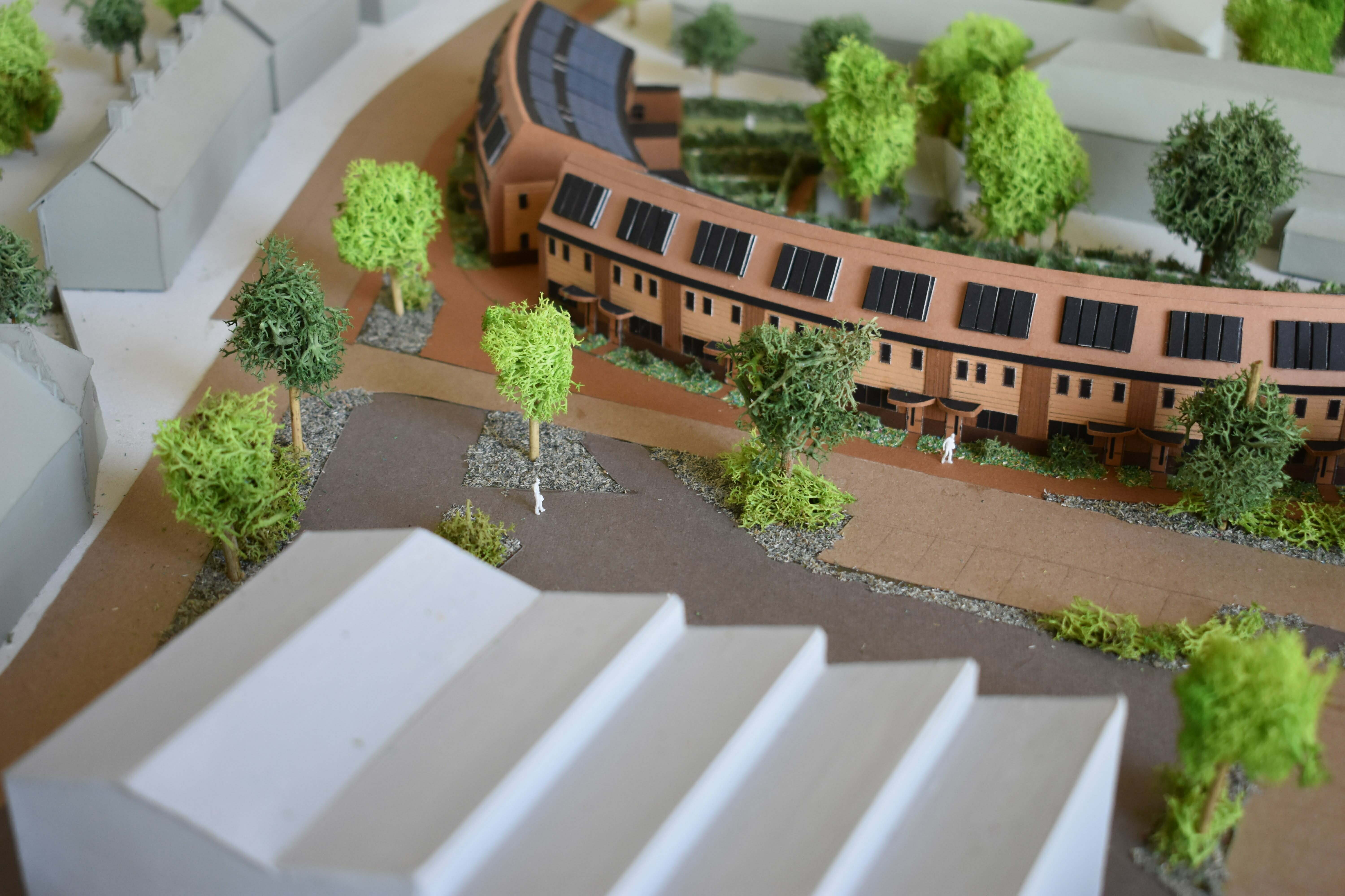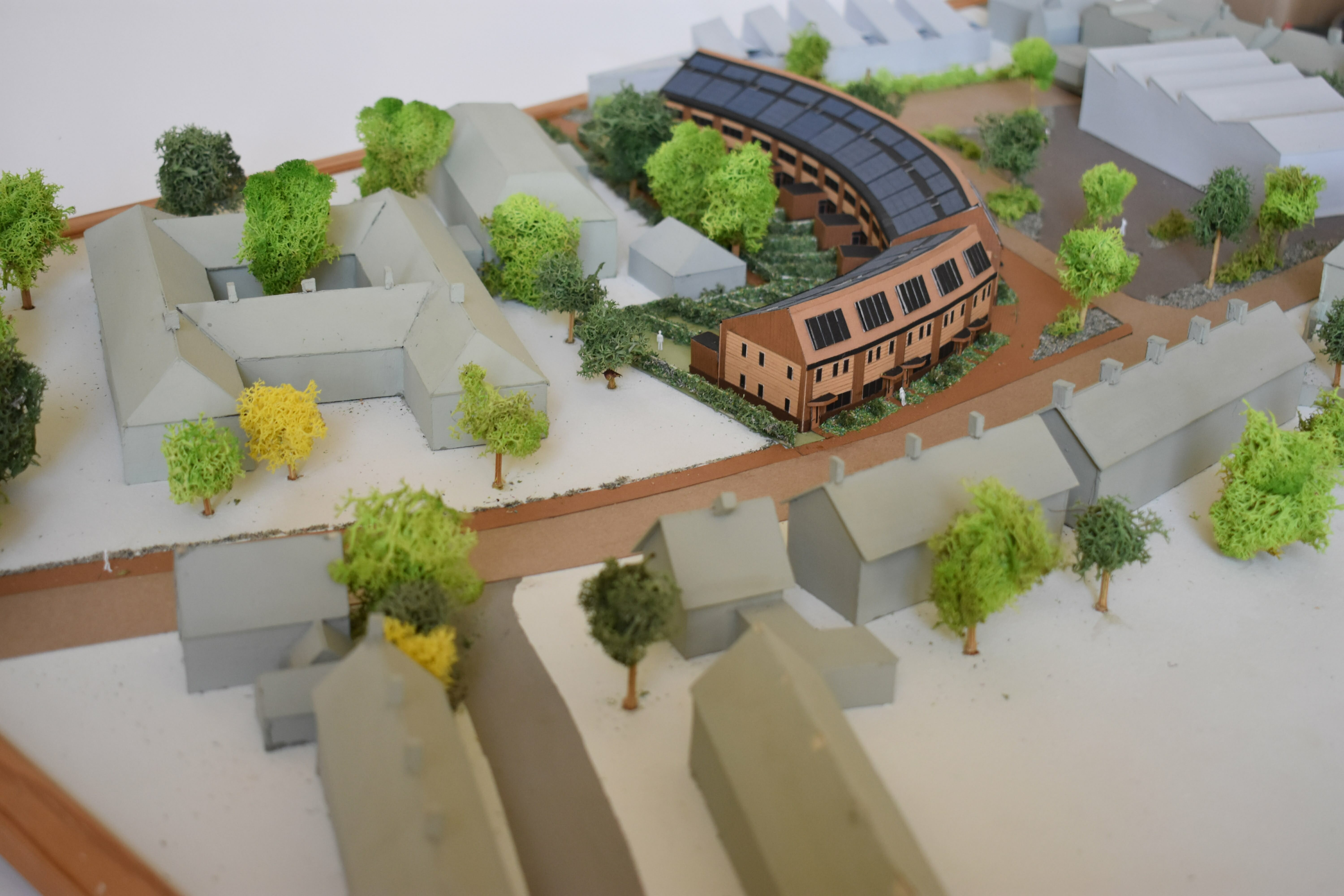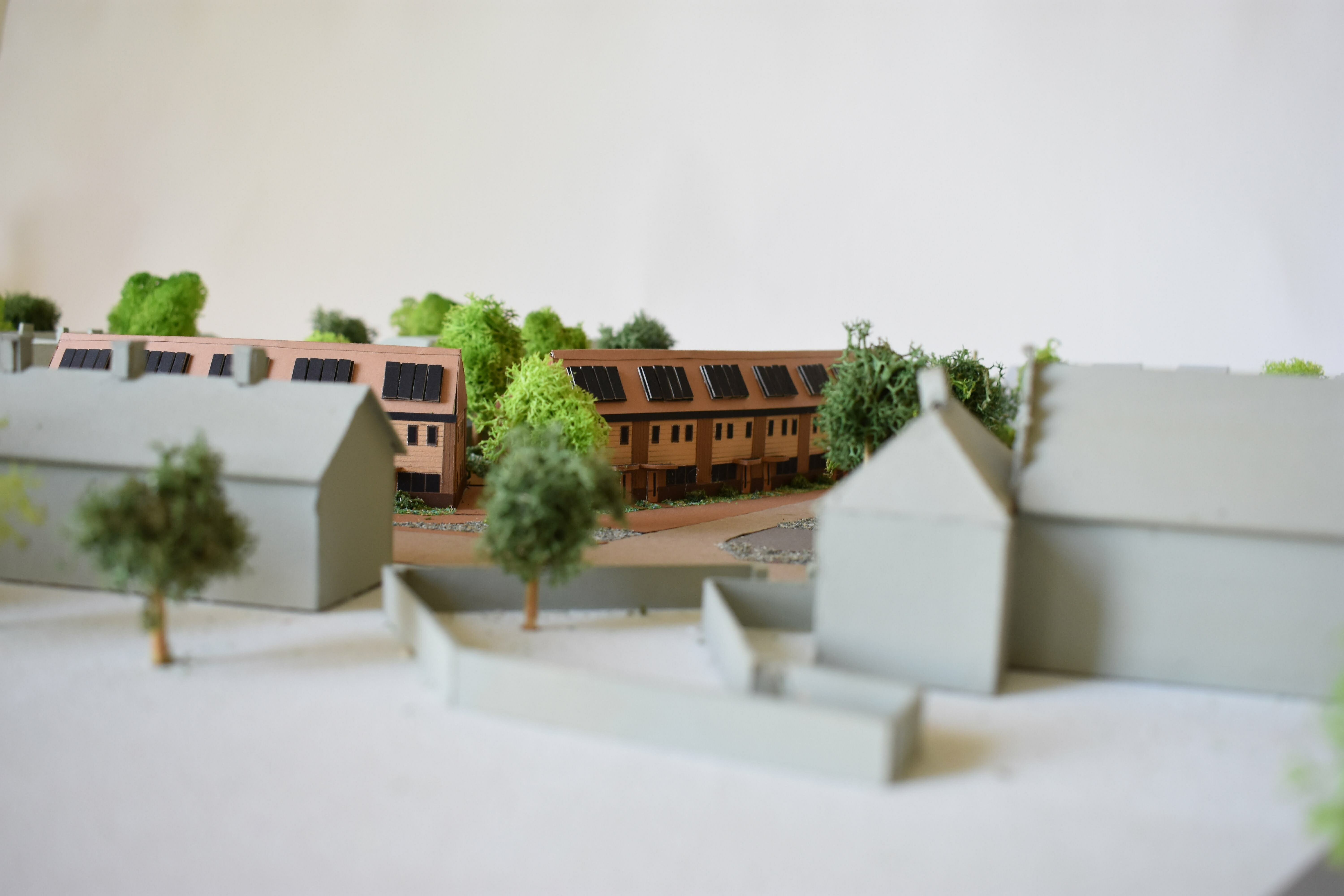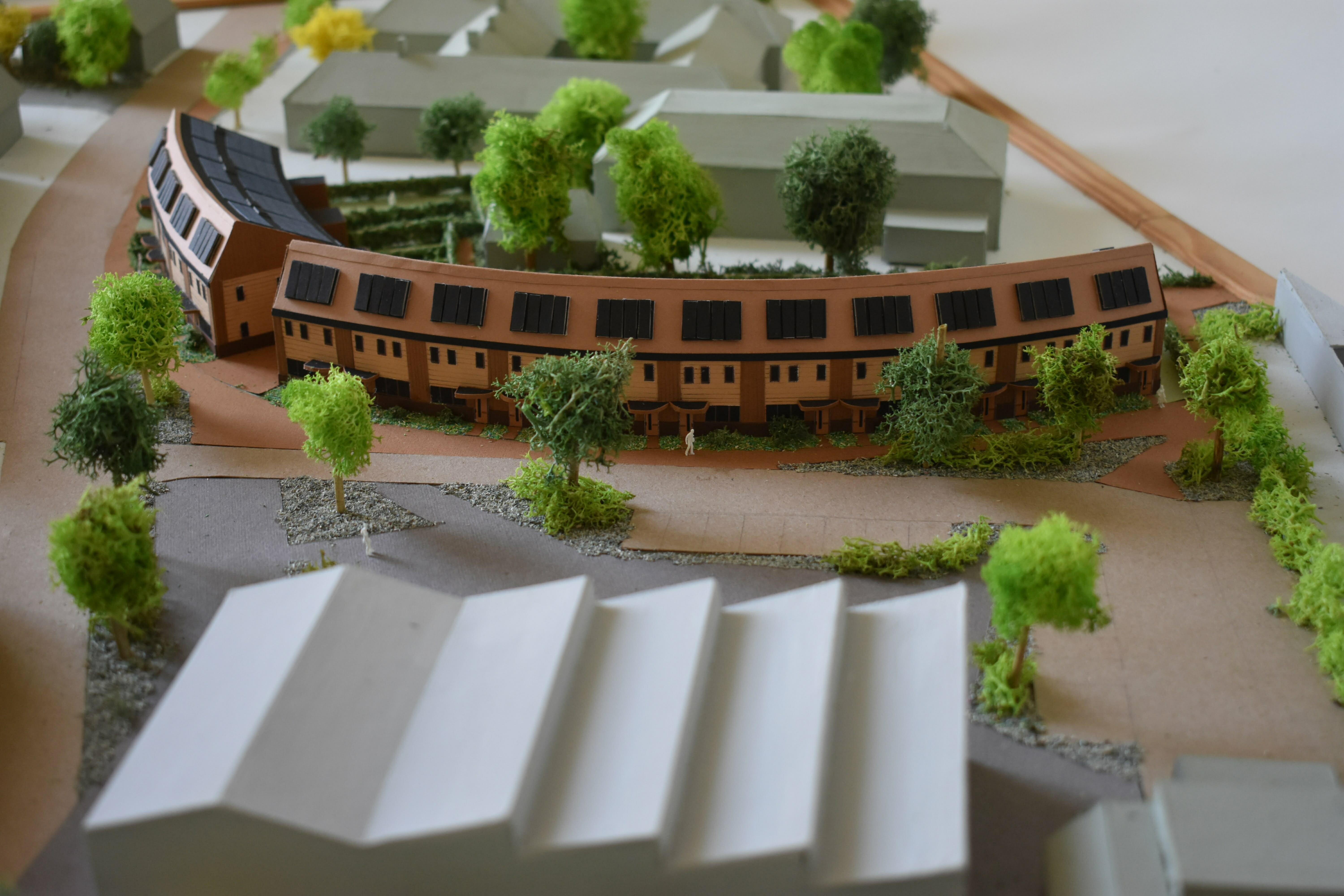 De woningen hebben smalle beukmaat en zijn diep. Hierdoor heeft de plattegrond altijd twee sferen, gericht naar activiteit (het schoolplein) of de rust (de tuin). De 16 woningen zijn uitermate geschikt om te fungeren als familiewoningen met karakter. Naast wonen moet er ruimte zijn voor werken, spelen en logeren. Een woning van 3 lagen heeft per verdieping een andere functie. Wonen op de begane grond aan de tuin, slapen op de meer gesloten tweede verdieping en logeren, spelen of werken op de flexibele 2e verdieping. De 2e verdieping bestaat uit een asymmetrische kap. Hierdoor ontstaat er veel dakoppervlak op het zuiden, dit zal gevuld worden met zonnepanelen. Op de noordzijde komt een stijl dakvlak, hieronder is de flexibele ruimte gesitueerd met veel daglicht. De voorzijde van de woning heeft kleine ramen, enerzijds voor het geluid van het schoolplein, anderzijds voor het verlies aan warmte op de noordzijde. De zuidzijde heeft daarentegen veel glas zodat de warmte naar binnenkomt. De entree van de woning krijgt een extra accent door de luifel boven de voordeur. Deze zorgt voor het ‘droog binnen komen’. Ten slotte is de voordeur een boerendeur. Deze deur heeft 2 draaiende delen. Samen met de luifel en het overgangsgebied van de voortuin zorgt dit voor meer sociale verbinding met de buren en buurtgenoten. De harde grens van privé naar publiek wordt versoepeld.