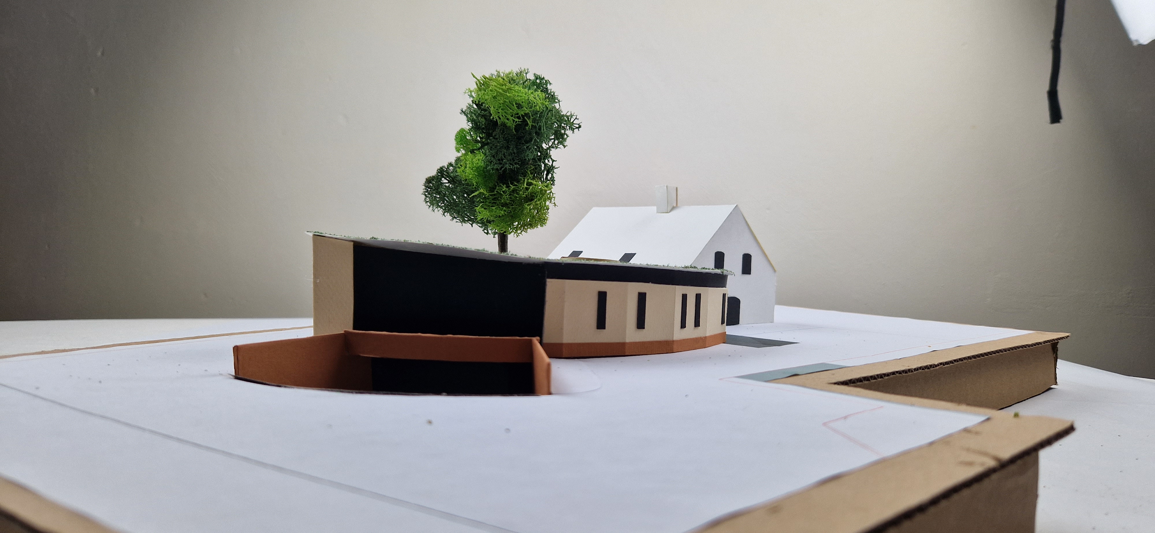 Uiteindelijk is er gekozen om een grote aanbouw te doen aan de achterzijde. Deze aanbouw krult rondom een bestaande boom. Hierdoor ontstaat er een beschutte plek. In de aanbouw zal een werkplek, slaapkamer, badkamer en grote leefruimte komen. Op de 1e verdieping van de boerderij komen de overige slaapkamers . Door de nieuwe aanbouw wordt er ruimte gecreëerd op de begane grond van de boerderij. Hier zal boerderij fungeren als schuur / opslag.