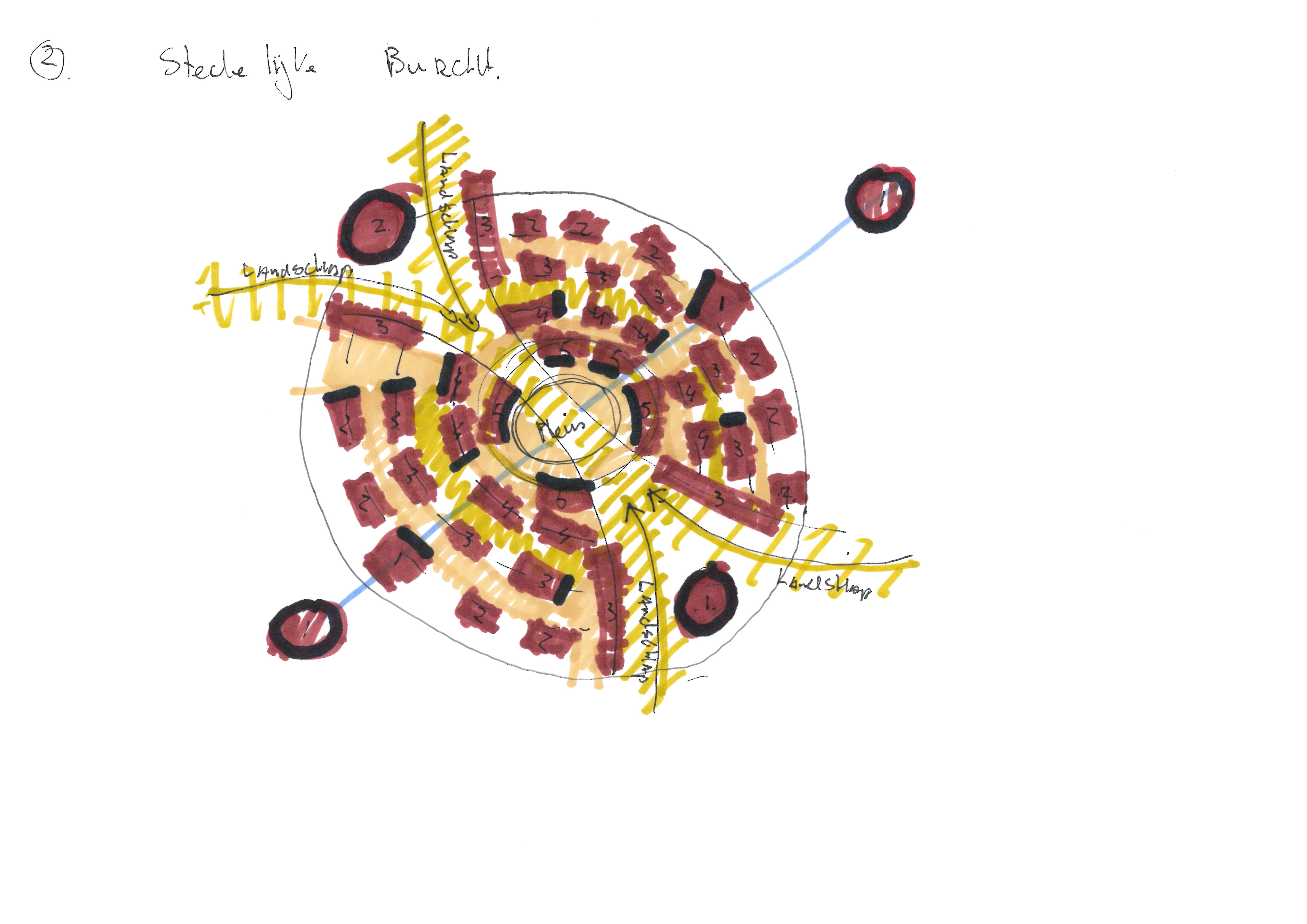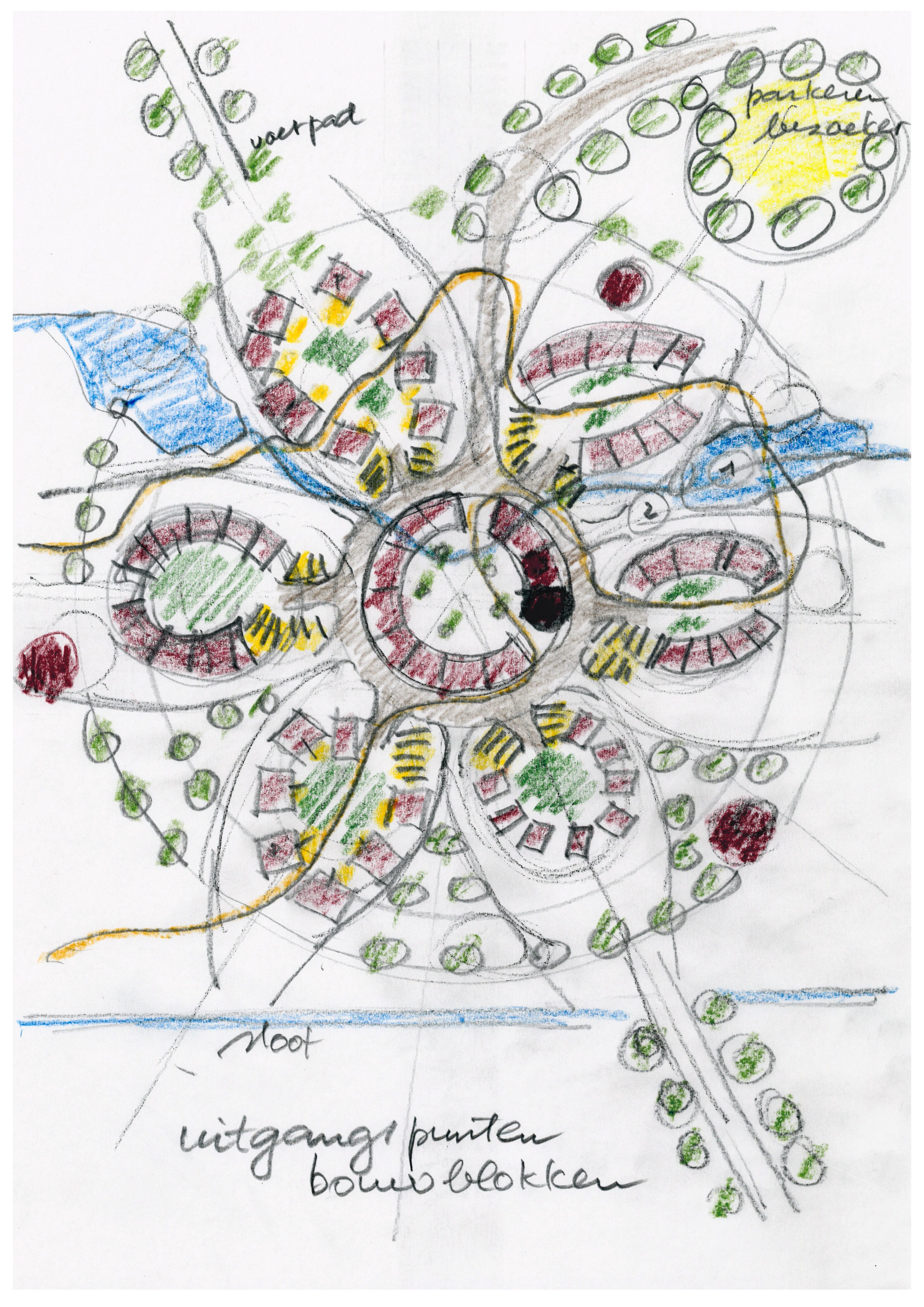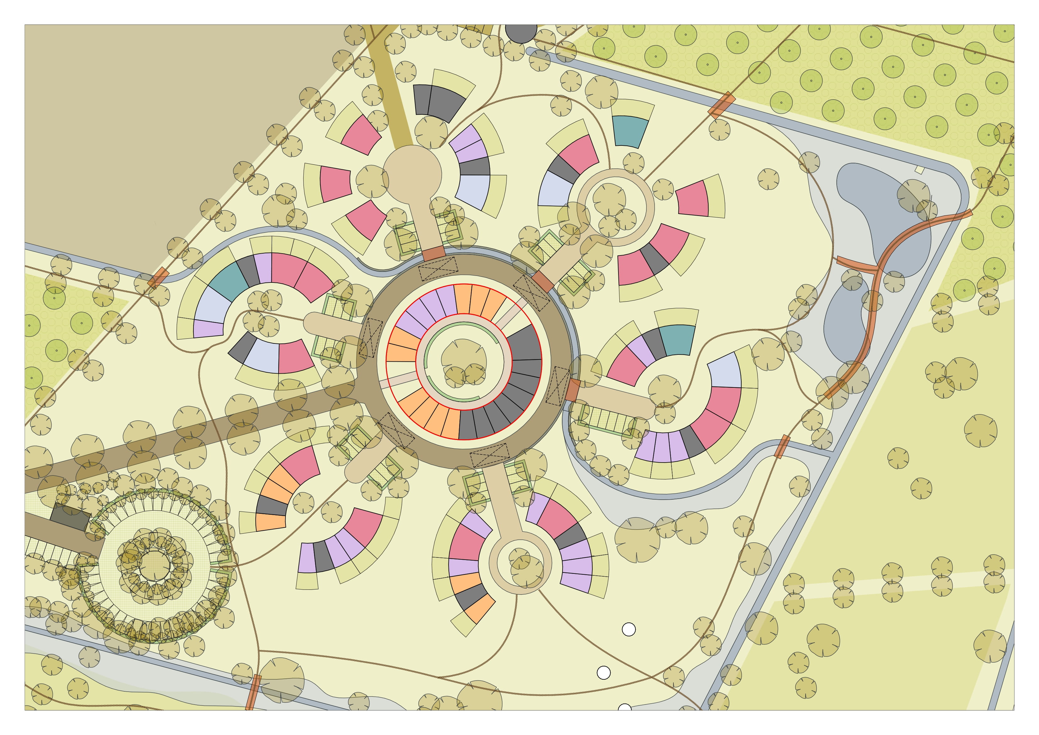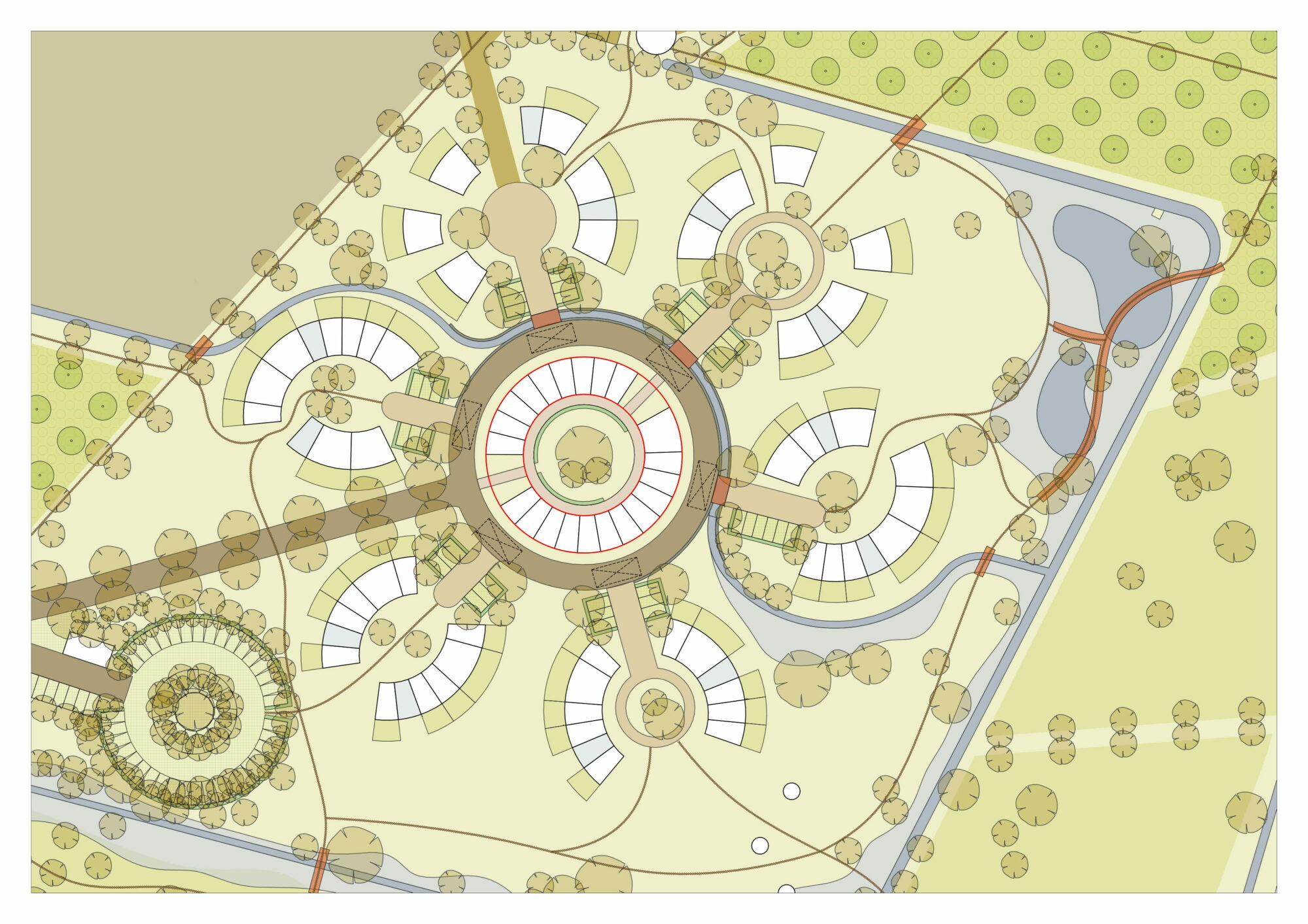 Via een lange bomenlaan, de hoofdontsluiting, wordt de bewoner en bezoeker begeleid naar het woongebied. De laan vormt een zichtlijn tot aan het centrum van de bebouwing met in het zicht een toren met gemeenschappelijke functies. Deze toren is een herkenningspunt op het landgoed. Via de eenrichtingsweg, ingericht als woonerf rond de havezate, worden de lobben ontsloten. Deze weg zal bestaan uit een open bestrating met voldoende draagkracht voor hulpdiensten. Alle woningen zijn te bereiken met een auto. Bij elk hofje zijn zes, in het groen gelegen, parkeerplaatsen. Boven de parkeerplaatsen kunnen zonnepanelen geplaatst worden. Het aanzicht wordt ingepakt met groen. In de grijze blokken bevinden zich collectieve bergingen en installaties. De grotere collectieve functies zijn gesitueerd in het centrum. Deze functies zijn, logeerkamers, vergaderplekken, ontmoetingsruimte, etc. De bestaande waterlopen worden opgenomen in het ontwerp. Een van deze waterlopen “stroomt” door het midden van het gebied en verbindt de aanwezige waterlopen. Hierdoor krijgt het water een belangrijke belevingswaarde in het woongebied. Overtollig regenwater wordt middels de sloten vastgehouden en afgevoerd. De woongebieden zijn verbonden door paden en zijn verschillend in hun ruimtelijke uitstraling. Hierdoor ontstaat er een gevarieerde beleving van de woongebieden en de omliggende natuur en wordt het een interessant gebied voor iedere bewonersgroep en elke bezoeker. Zitelementen voor ouderen en speelelementen voor kinderen zijn hierbij belangrijk. De openbare ruimte wordt hierdoor interessant in beleving en gebruik.