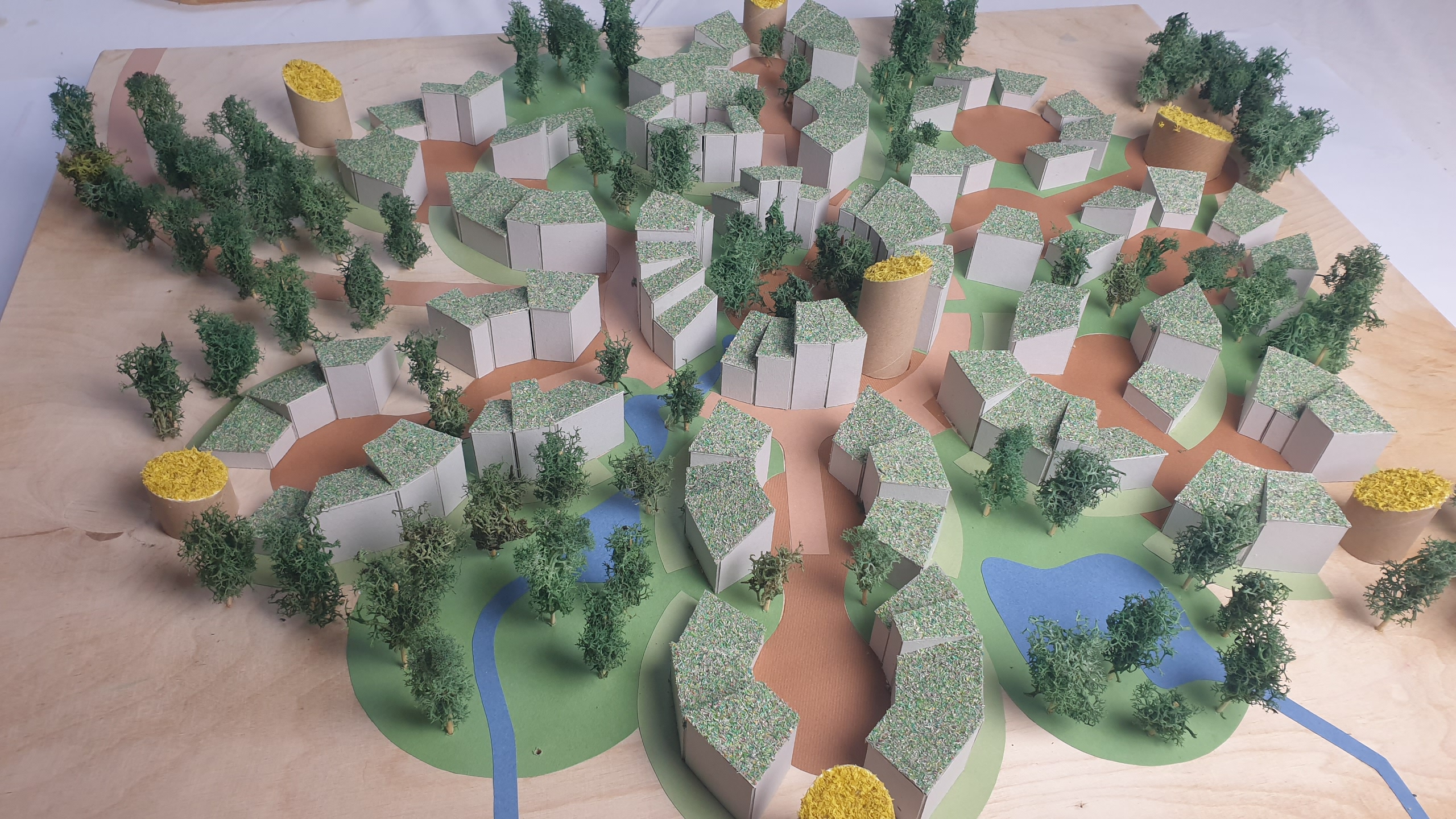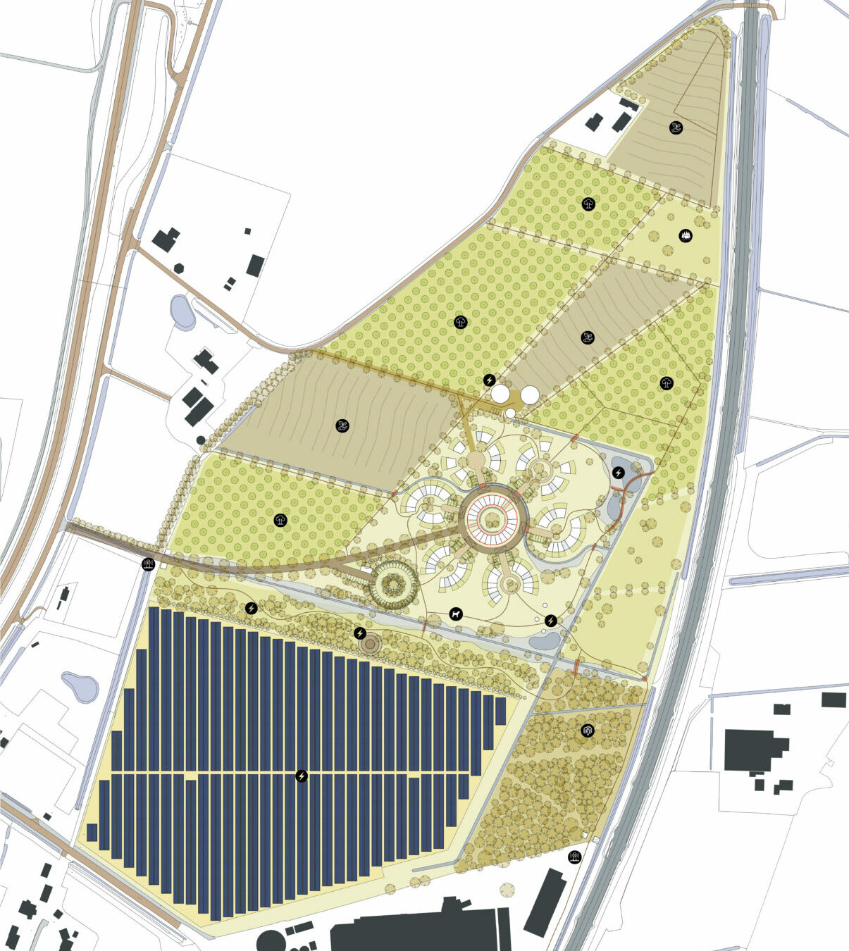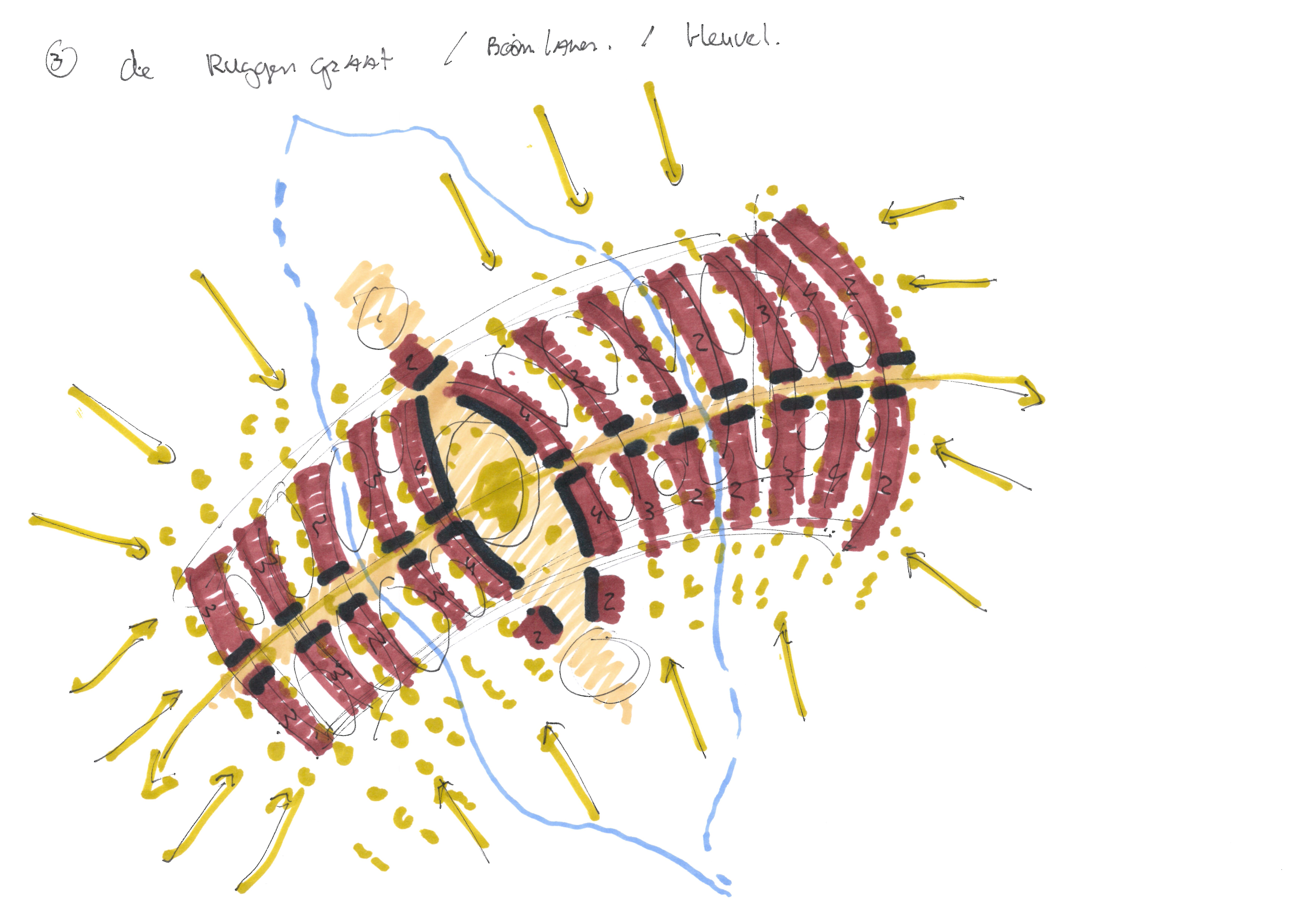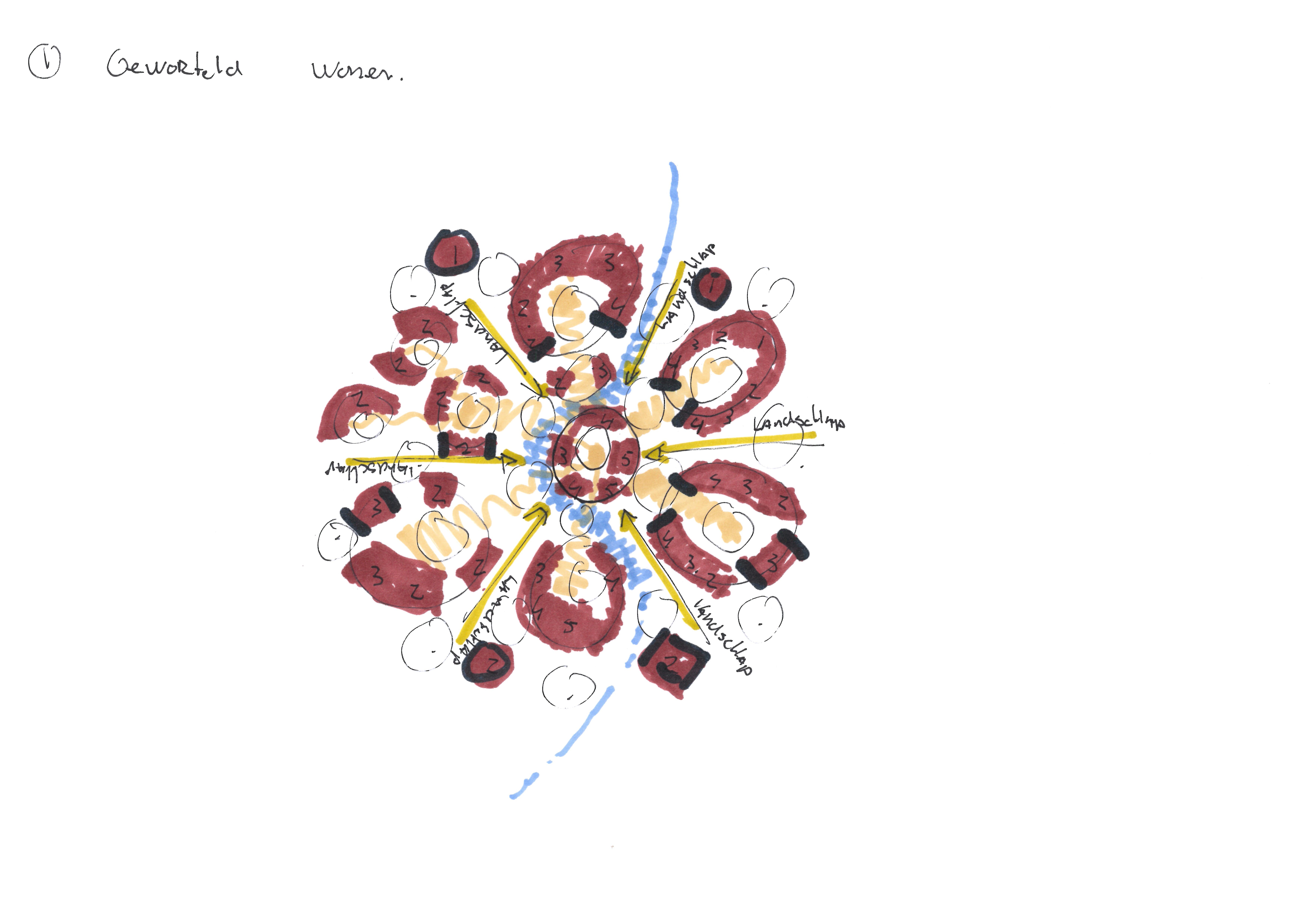 Via een lange bomenlaan, de hoofdontsluiting, wordt de bewoner en bezoeker begeleid naar het woongebied. De laan vormt een zichtlijn tot aan het centrum van de bebouwing met in het zicht een toren met gemeenschappelijke functies. Deze toren is een herkenningspunt op het landgoed. Via de eenrichtingsweg, ingericht als woonerf rond de havezate, worden de lobben ontsloten. Deze weg zal bestaan uit een open bestrating met voldoende draagkracht voor hulpdiensten. Alle woningen zijn te bereiken met een auto. Bij elk hofje zijn zes, in het groen gelegen, parkeerplaatsen. Boven de parkeerplaatsen kunnen zonnepanelen geplaatst worden. Het aanzicht wordt ingepakt met groen. In de grijze blokken bevinden zich collectieve bergingen en installaties. De grotere collectieve functies zijn gesitueerd in het centrum. Deze functies zijn, logeerkamers, vergaderplekken, ontmoetingsruimte, etc. De bestaande waterlopen worden opgenomen in het ontwerp. Een van deze waterlopen “stroomt” door het midden van het gebied en verbindt de aanwezige waterlopen. Hierdoor krijgt het water een belangrijke belevingswaarde in het woongebied. Overtollig regenwater wordt middels de sloten vastgehouden en afgevoerd. De woongebieden zijn verbonden door paden en zijn verschillend in hun ruimtelijke uitstraling. Hierdoor ontstaat er een gevarieerde beleving van de woongebieden en de omliggende natuur en wordt het een interessant gebied voor iedere bewonersgroep en elke bezoeker. Zitelementen voor ouderen en speelelementen voor kinderen zijn hierbij belangrijk. De openbare ruimte wordt hierdoor interessant in beleving en gebruik.