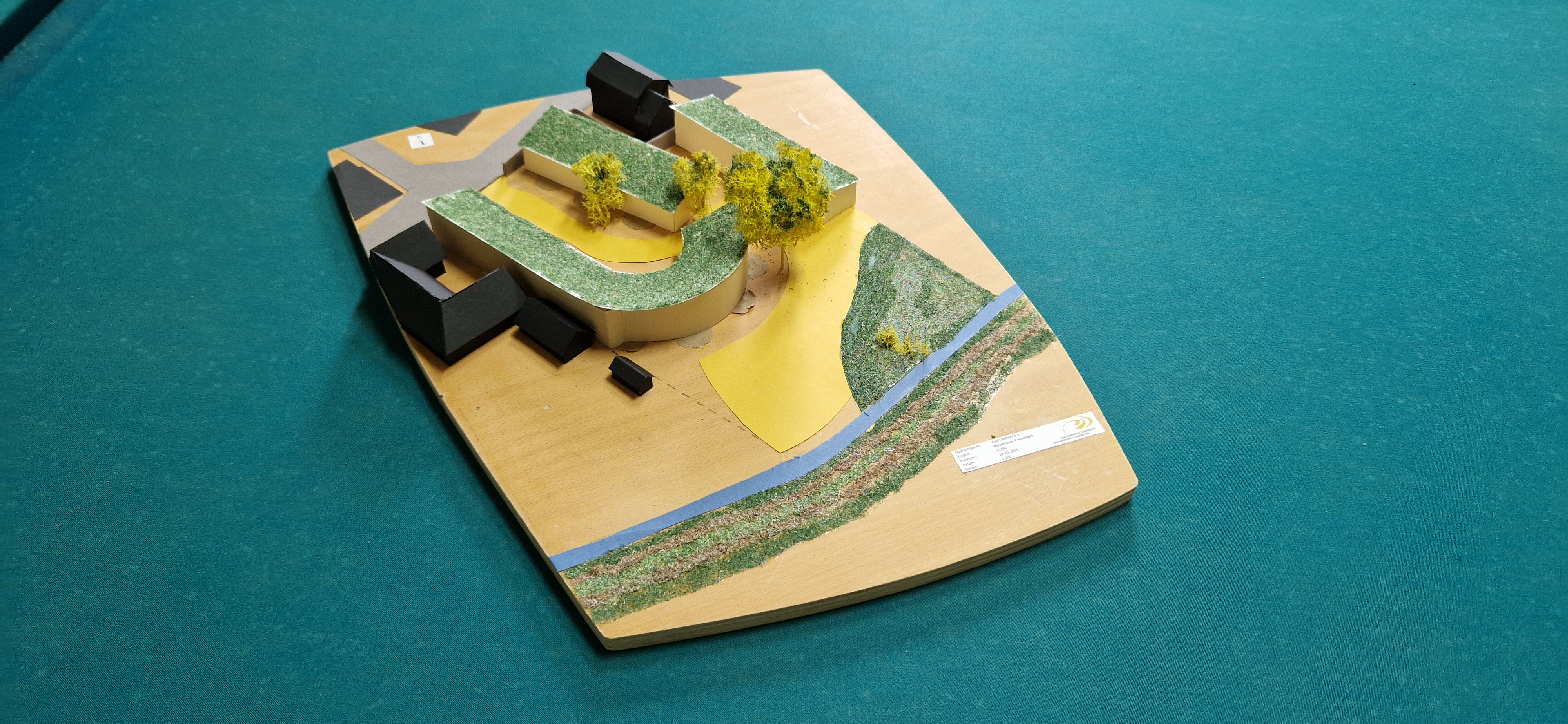 We hebben verschillende bouwvormen onderzocht. Een lessenaarskap zoals de maquette met het lage deel aan de binnenplaats, maar ook een die gespiegeld is. Het is belangrijk om aan te sluiten op de omliggende bebouwing die 1,5 a 2 lagen is. De bebouwing komt door de kap vorm hier ergens tussen te liggen qua hoogte. Vanuit het midden gebied is het sedumdak zichtbaar. In deze maquette is wel goed de uitstraling van het bouwblok te zien. Het landschap wordt doorgezet via de bebouwing tot op de straat. Dit door strategische plaatsing van bomen, sedumdaken en natuurlijke kleurtinten. Er is gekozen voor een gezamenlijk en samenhorig karakter. De bewoners hebben geen grote privé tuinen maar privé vlonders. Er is plek genoeg in de moestuin om te genieten van het landschap.
